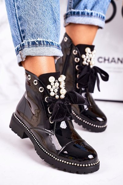 Утеплені чоботи з перлами, шпильками та стрічкою, лакована чорна перла