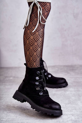 Жіночі замшеві чоботи на плоскій підошві на шнурівці чорні Firmina