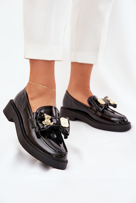 Лаковані мокасини з бантиком і декоративною брошкою чорні Leandriel