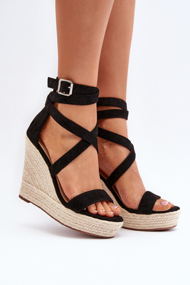 Босоніжки на танкетці та плетеному ремінці. Чорний сальт