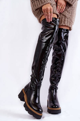 Модні лаковані жіночі чоботи вище коліна чорного кольору