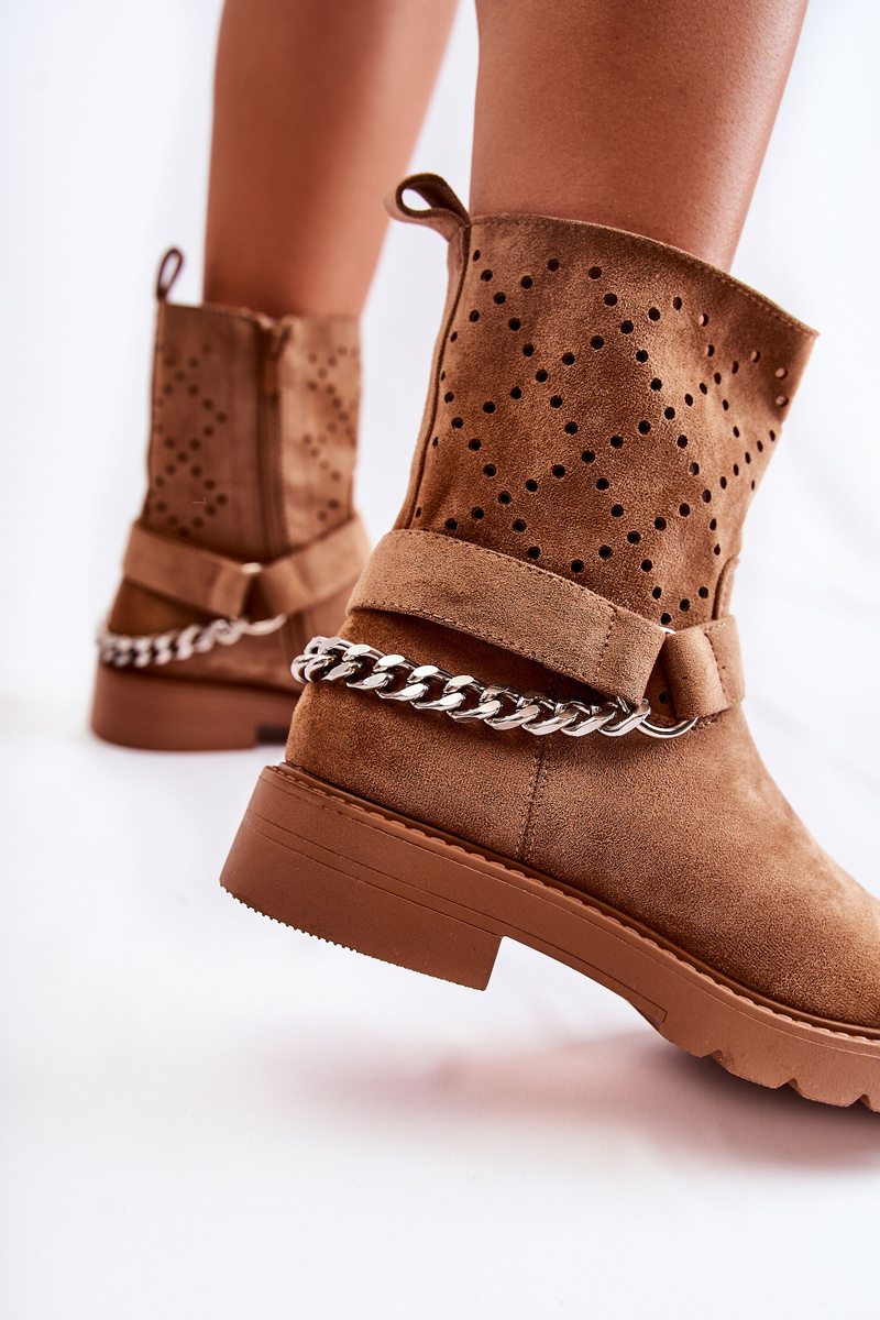 Чудові жіночі чобітки виготовлені з еко замші з ажурним візерунком. Застібається на блискавку збоку верху. Мають декоративний ланцюжок і посилений каблук. Встановлені на плоску п'яту, що робить їх надзвичайно зручними та стійкими. У даній моделі м'яка устілка з еко шкіри. Обов'язково перегляньте інші черевики, доступні в нашій пропозиції! При виборі розміру скористайтеся таблицею розмірів.