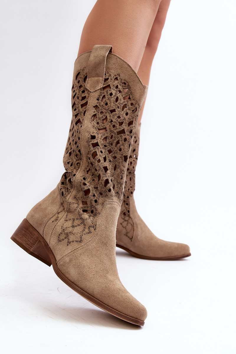 Бежеві жіночі ажурні чоботи Zazoo 3403 на низькому каблуці