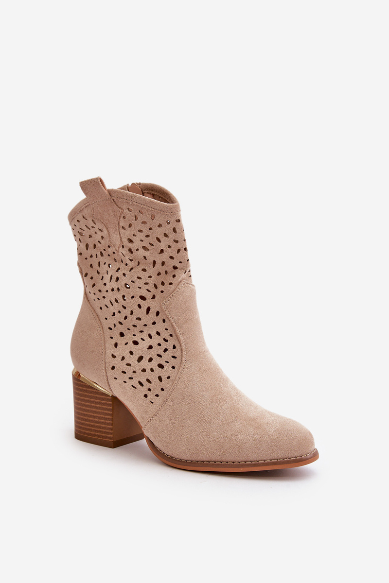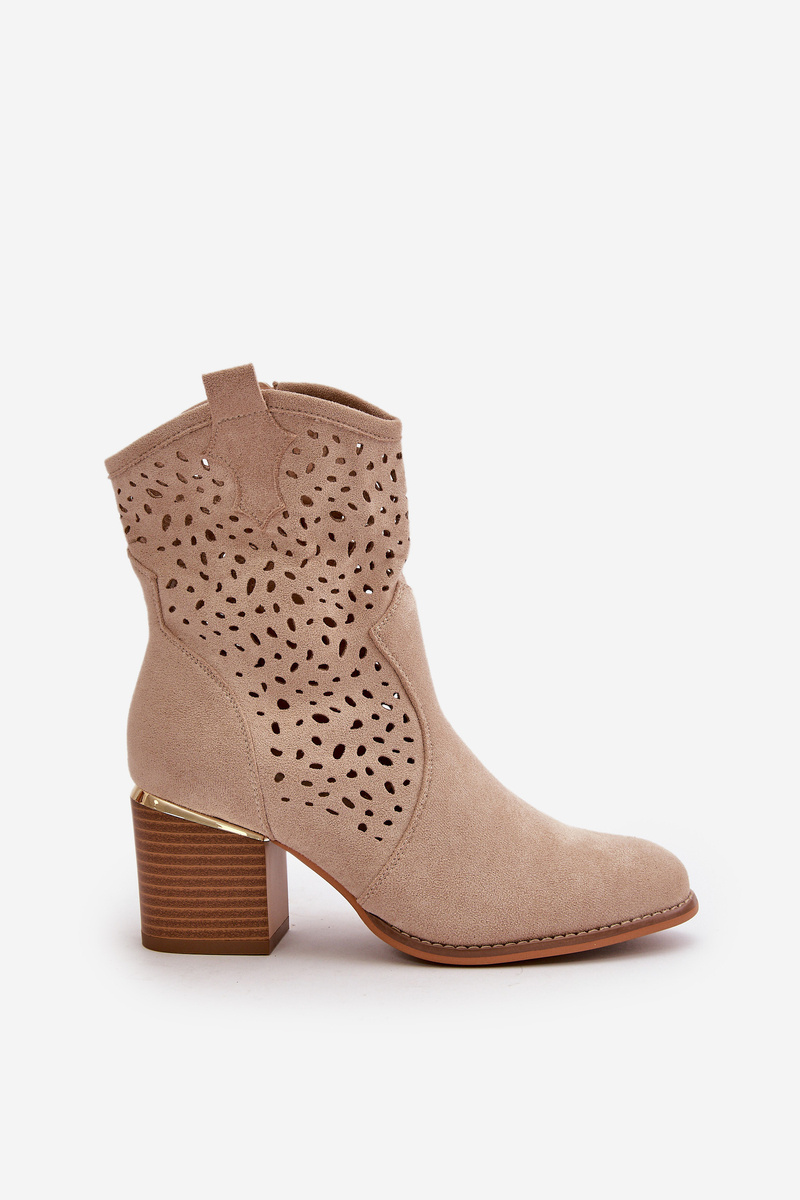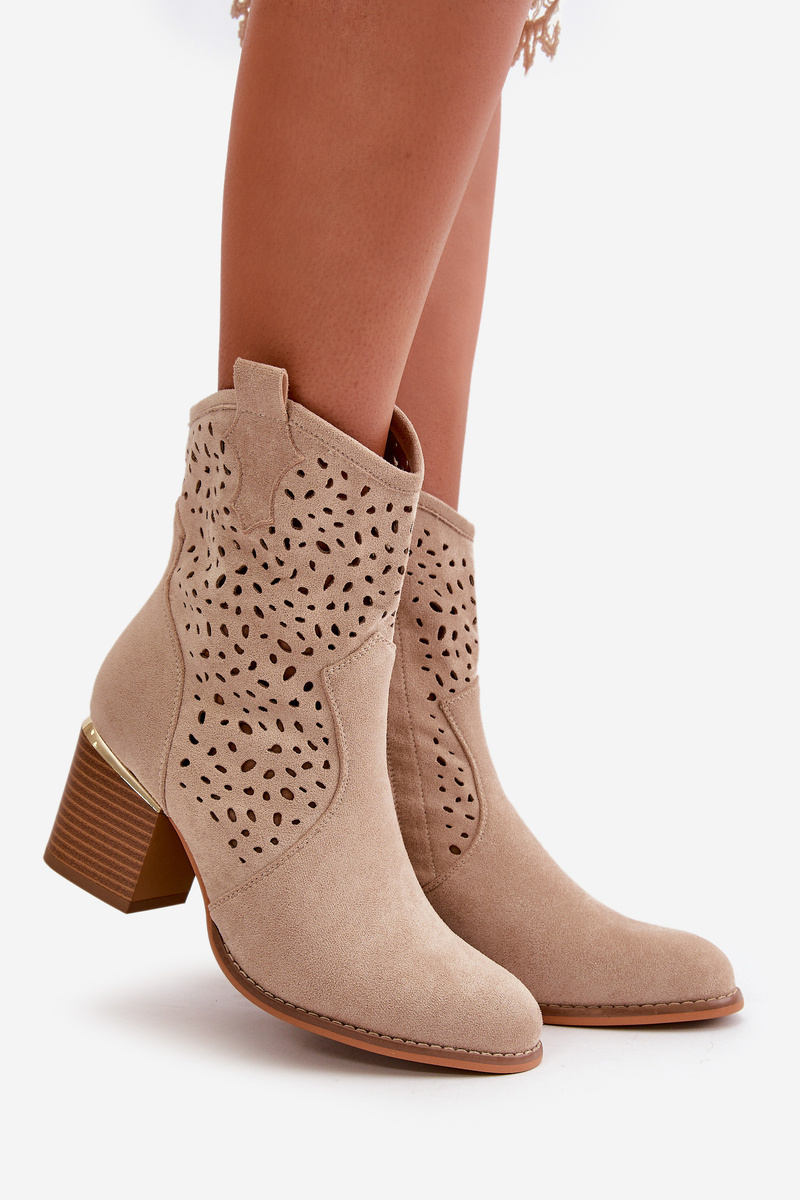 Жіночі чоботи з еко-замші з гратчастим верхом, що досягає щиколотки. Встановлені на елегантний каблук-колонку, прикрашений золотим елементом, що надає їм унікального характеру. Застібається на блискавку, що забезпечує зручність використання. Закруглені пальці підкреслюють їх класичний і стильний вигляд. Ідеально підходить для повсякденного та елегантного стилю. Обираючи розмір, орієнтуйтеся на таблицю розмірів.