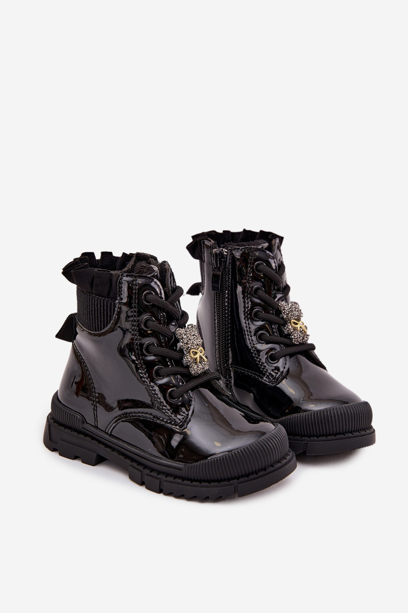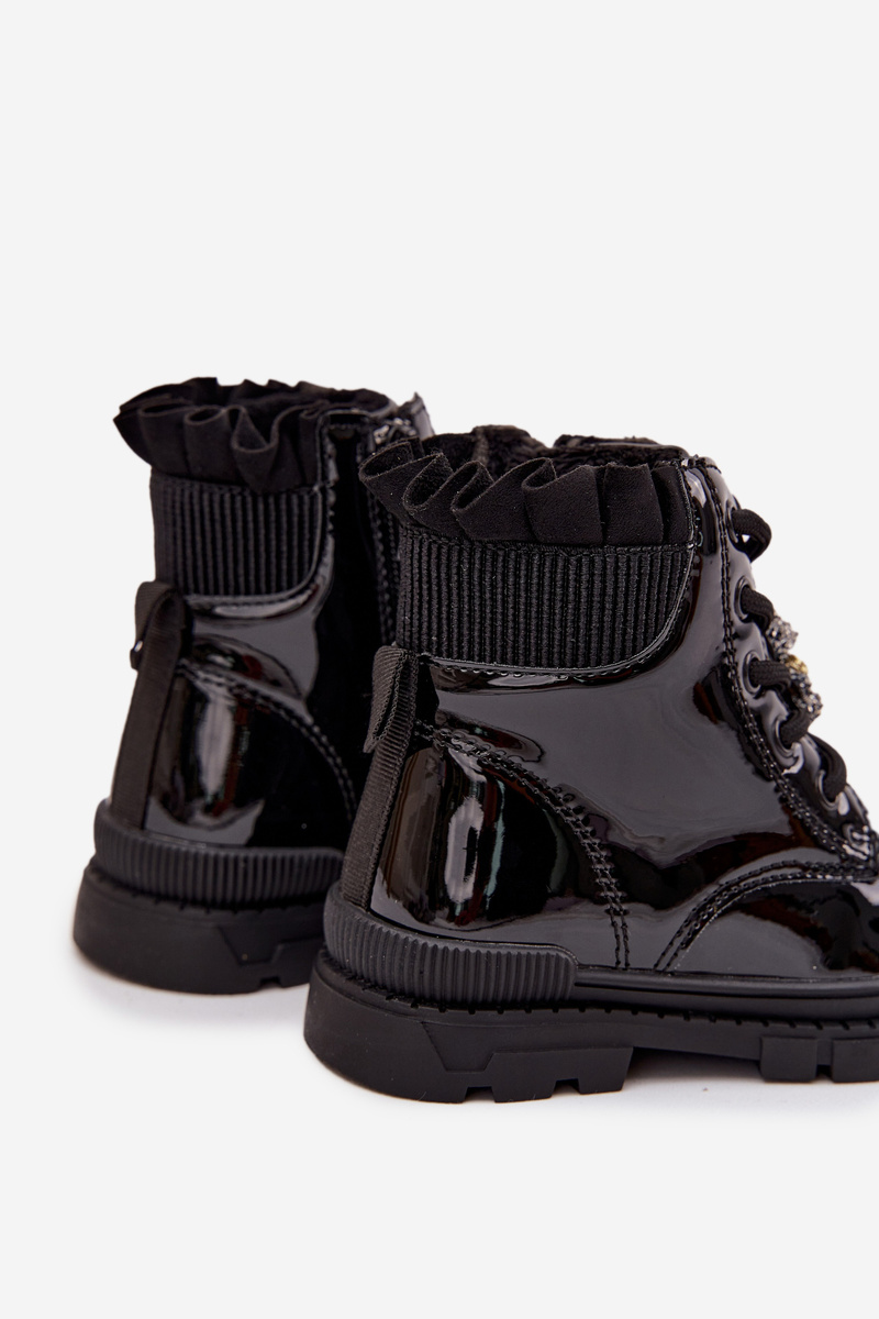 Дитячі черевики з лакованої екошкіри — стильна і практична пропозиція для холодних днів. Внутрішня частина утеплена м’яким хутром, що забезпечує тепло і зручність, а бічний блискавка полегшує одягання. Милий значок у вигляді ведмедика, розміщений на шнурівці, додає особливого дитячого шарму. Ідеально підходять для осені та зими. Будь ласка, зверніться до розмірної сітки при виборі розміру.