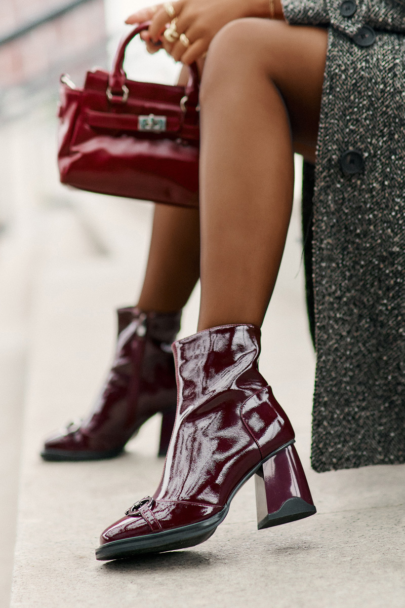 Жіночі ботильйони з лакованої екошкіри – стильний вибір для прохолодних днів. На стійкому каблуці вони додають силуету елегантності та сучасності. Модель має квадратні носки та декор спереду, що підкреслює її модний характер. Утеплені взуттєвим флісом, вони забезпечують комфорт і тепло, а блискавка дозволяє легко їх одягнути. Ідеально підходить для елегантного та відкритого стилю. Обираючи розмір, орієнтуйтеся на таблицю розмірів.
