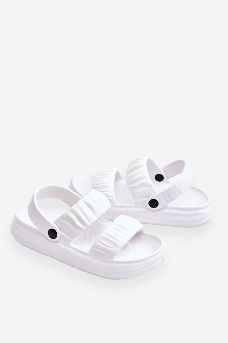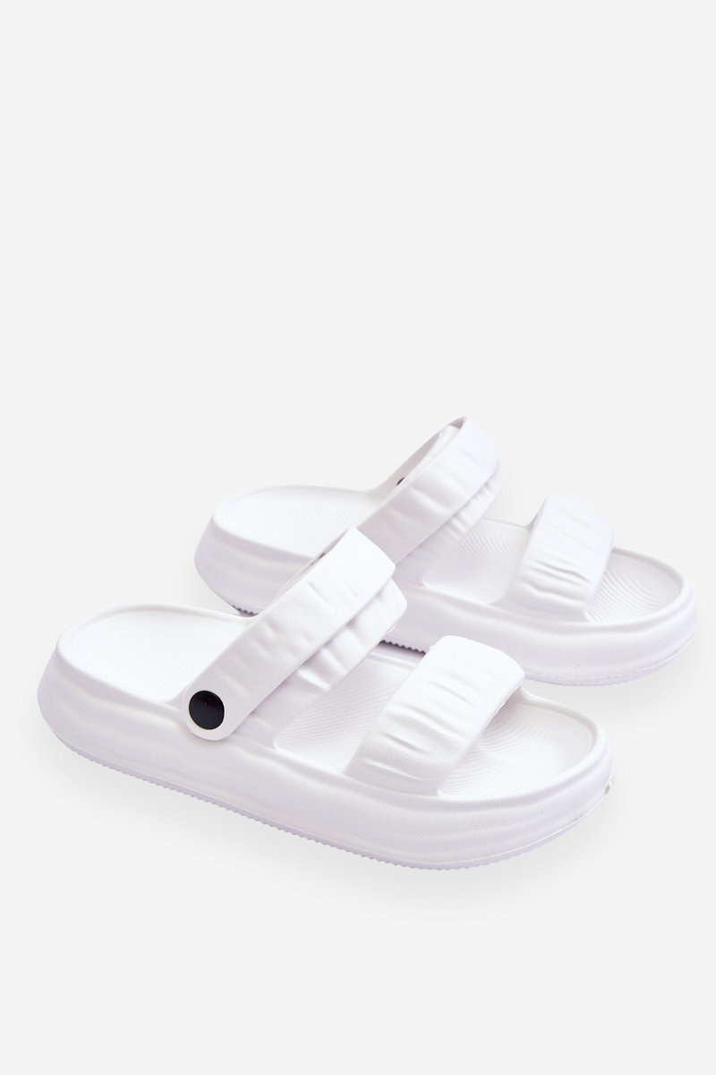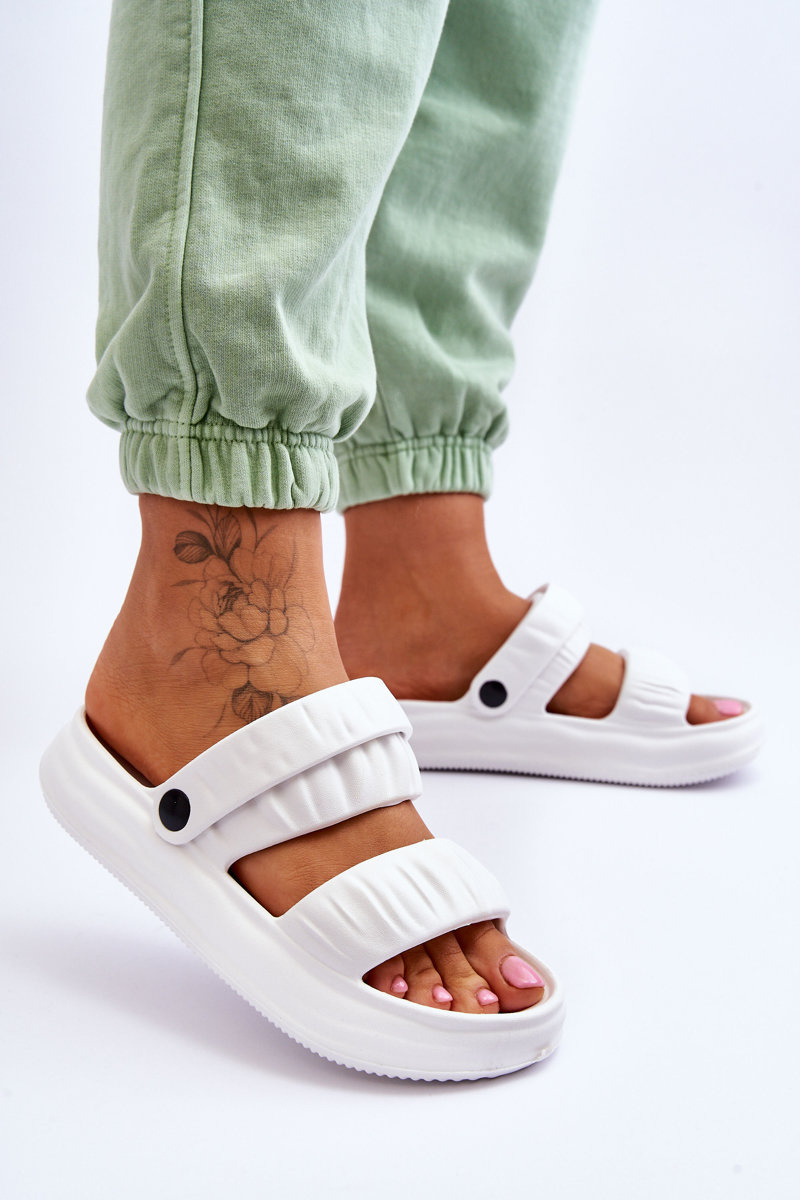 Легкі жіночі тапочки, які можна швидко змінити на босоніжки! Просто натягніть ремінь на задню частину стопи. Шльопанці виготовлені зі спіненого матеріалу. Смуги жорсткі і злегка зморшкуваті. Ця модель встановлена на масивній платформі. Вони будуть чудові в спекотні дні! Обираючи розмір, орієнтуйтеся на таблицю розмірів.