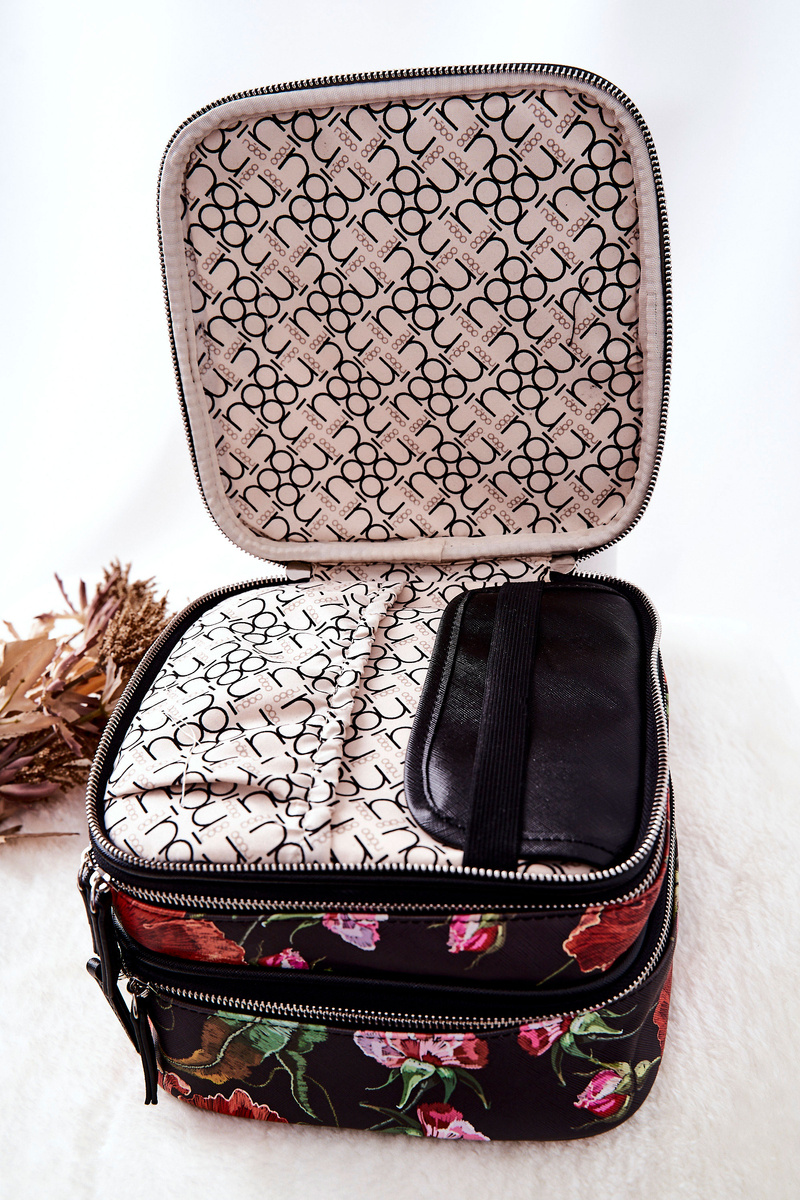 Косметичка виконана з екошкіри з гарним принтом. Він також може служити багажником. Має три блискавки, завдяки яким ми маємо зручний доступ до вмісту. У верхньому відділенні є прорізна кишеня на гумці та окрема гумка для косметики. У середньому відділенні можна вільно розмістити різні дрібниці. Нижня кишеня глибша за середню і також не має кишень і гумок, як середнє відділення. Вся внутрішня частина оброблена тканиною з логотипом бренду NOBO.