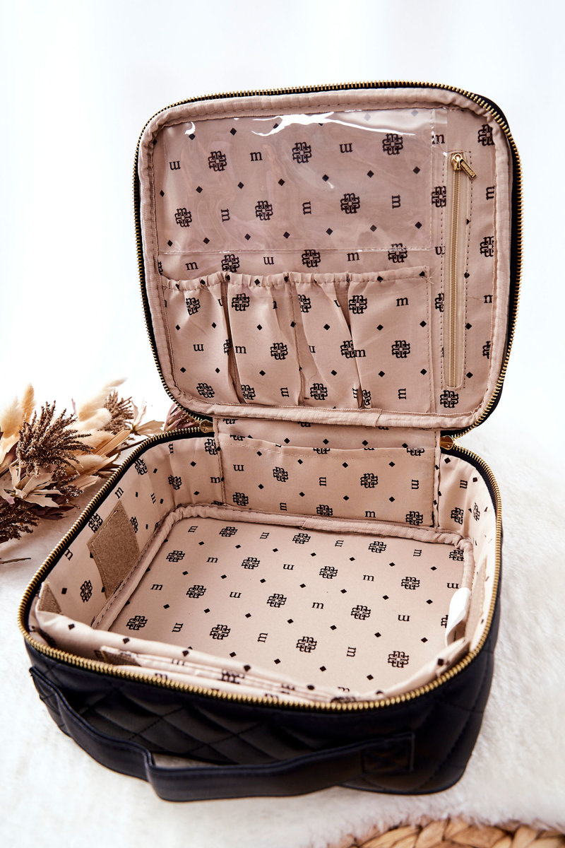Косметичка виготовлена ​​з еко шкіри. Його також можна використовувати як зручну сумку-органайзер. Верх прикрашений стьобанням. Застібка на одну блискавку забезпечує легкий доступ до вмісту. Всередині багато місця, яке розділене на кілька різних кишень. Завдяки застібці на липучці відділень ви можете змінити внутрішню частину відповідно до своїх потреб. Також є кишеня на блискавці та декілька менших кишеньок для гумок. Внутрішня частина косметики заповнена яскравою підкладкою з логотипом.