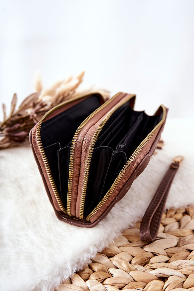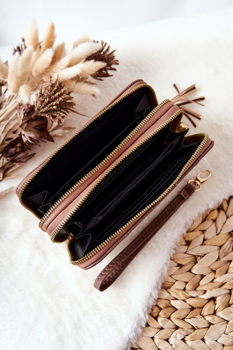 Великий і практичний гаманець застібається ззовні на дві блискавки. В одному з відділень можна знайти монети, купюри та візитні картки, а в іншому — невеликий смартфон, купюри чи документи. Зовні гаманець виконаний зі стьобаної екошкіри, на блискавках є китиці. Крім того, в комплекті є пояс.