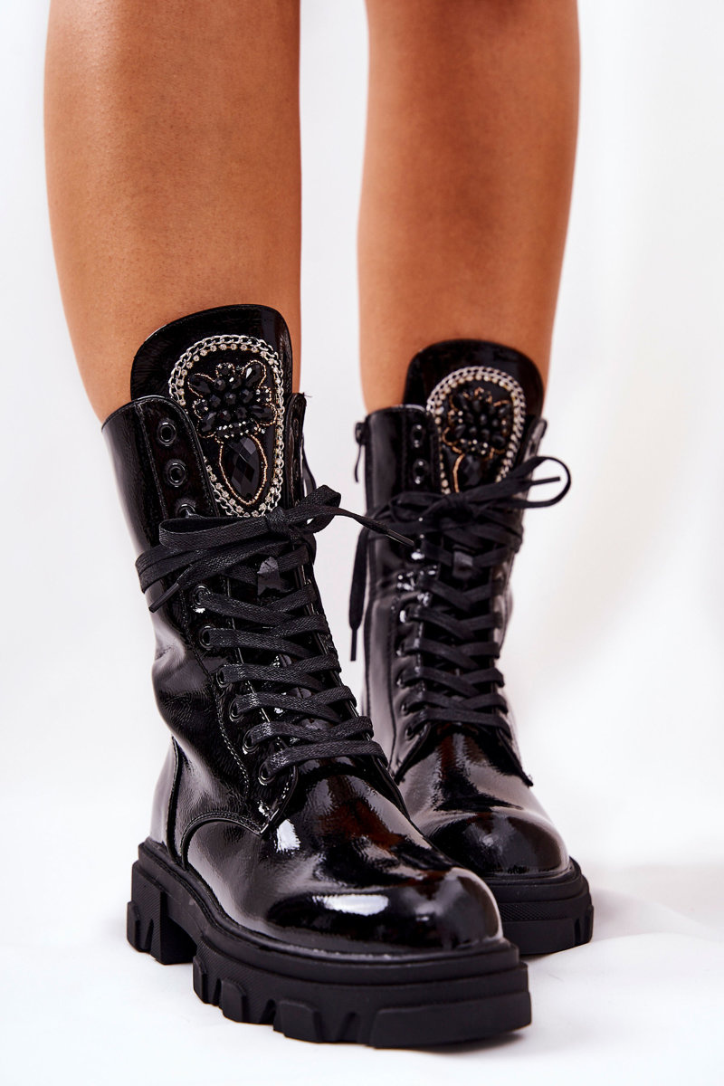 Чудові високі черевики мають бус, цирконій і ланцюжок на язичку. Виготовлений з лакованої еко шкіри. Оснащений застібкою та блискавкою для зручного взування. Масивна підошва-трапер забезпечує стабільність на кожному кроці. Утеплення у вигляді ніжного хутра всередині. Під час вибору розміру зверніться до таблиці розмірів