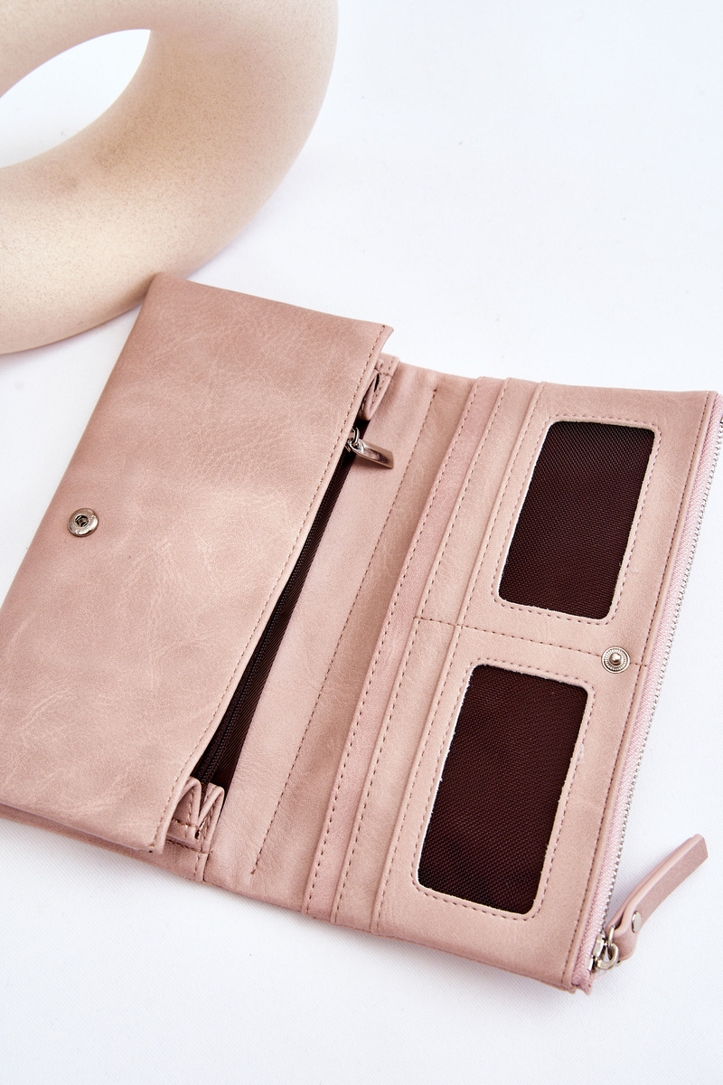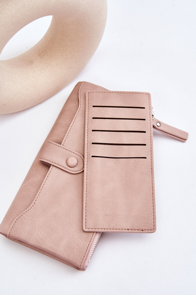 Великий жіночий гаманець застібається на кнопки та блискавку. Виконана з еко шкіри. Всередині є відкриті камери і одна закрита на блискавку. Крім того, гаманець також містить багато місць для візиток або кредитних карток. Зовні також є додаткова кишеня, що закривається на блискавку, і ще одне відділення, що застібається на кнопку. У цьому гаманці помістяться найнеобхідніші речі, такі як: документи або гроші.