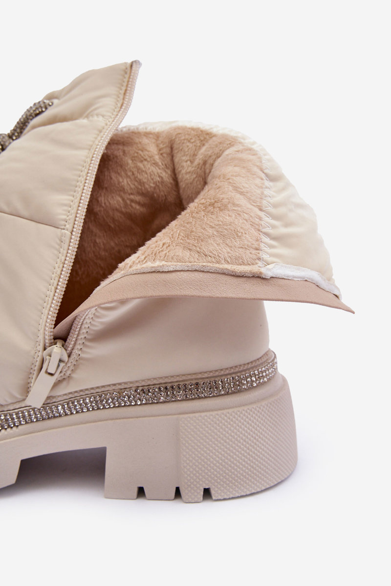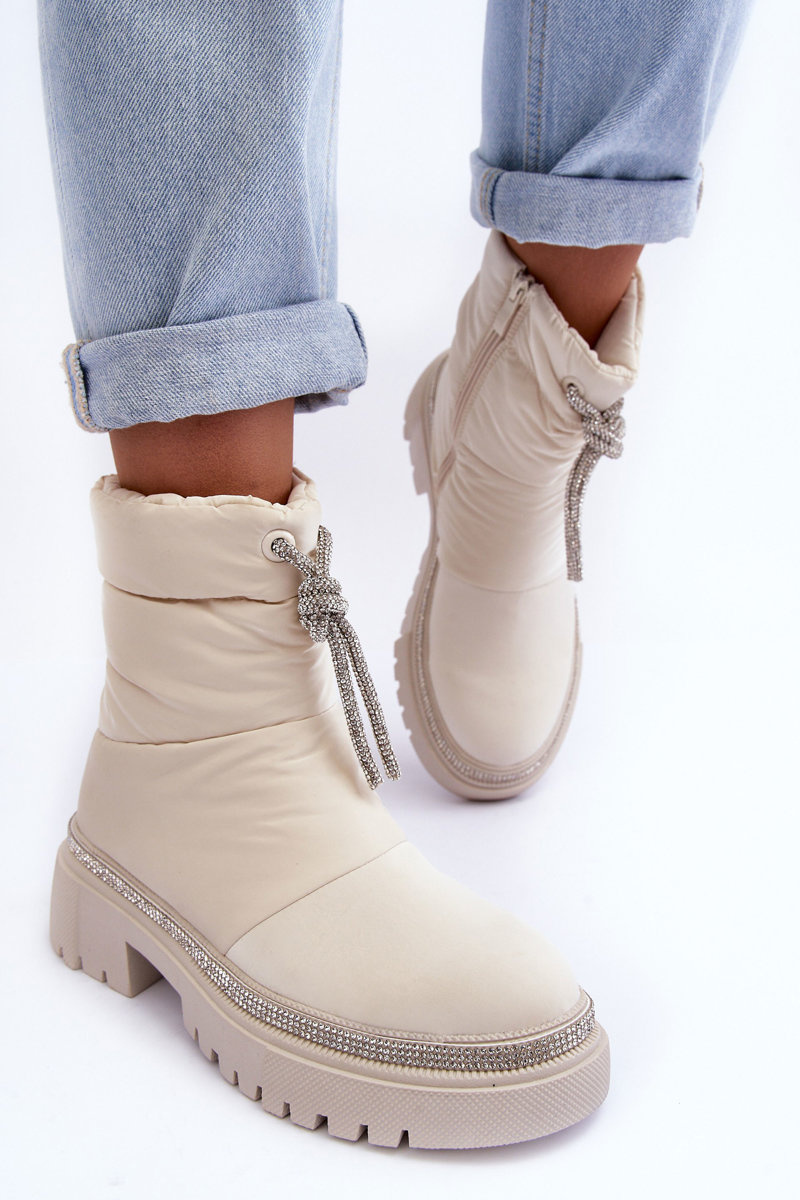 Сноуботи жіночі на плоскому каблуці та платформі. Виготовлений з текстильного матеріалу. Дана модель всередині обшита густим хутром. Застібається на блискавку. Прикраса у вигляді дрібних блискучих страз. Вони також мають жорсткий носок. Вибираючи розмір, орієнтуйтеся на таблицю розмірів.