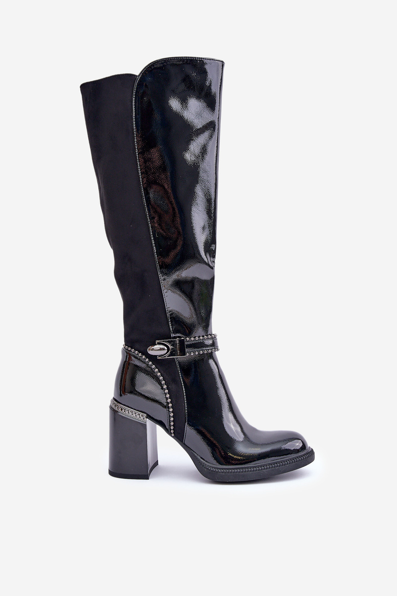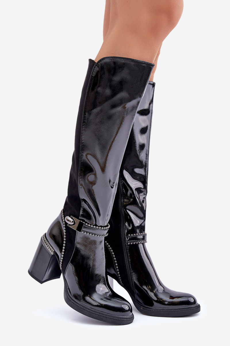 Стильні жіночі ботильйони на блочному каблуці. Виготовлені з комбінації лакованої еко шкіри та еко замші. Ця модель має прикраси на хвостовику. Пальці ніг округлі. Внутрішня частина злегка утеплена взуттєвим флісом. Стрижень доходить до коліна. Обираючи розмір, орієнтуйтеся на таблицю розмірів.