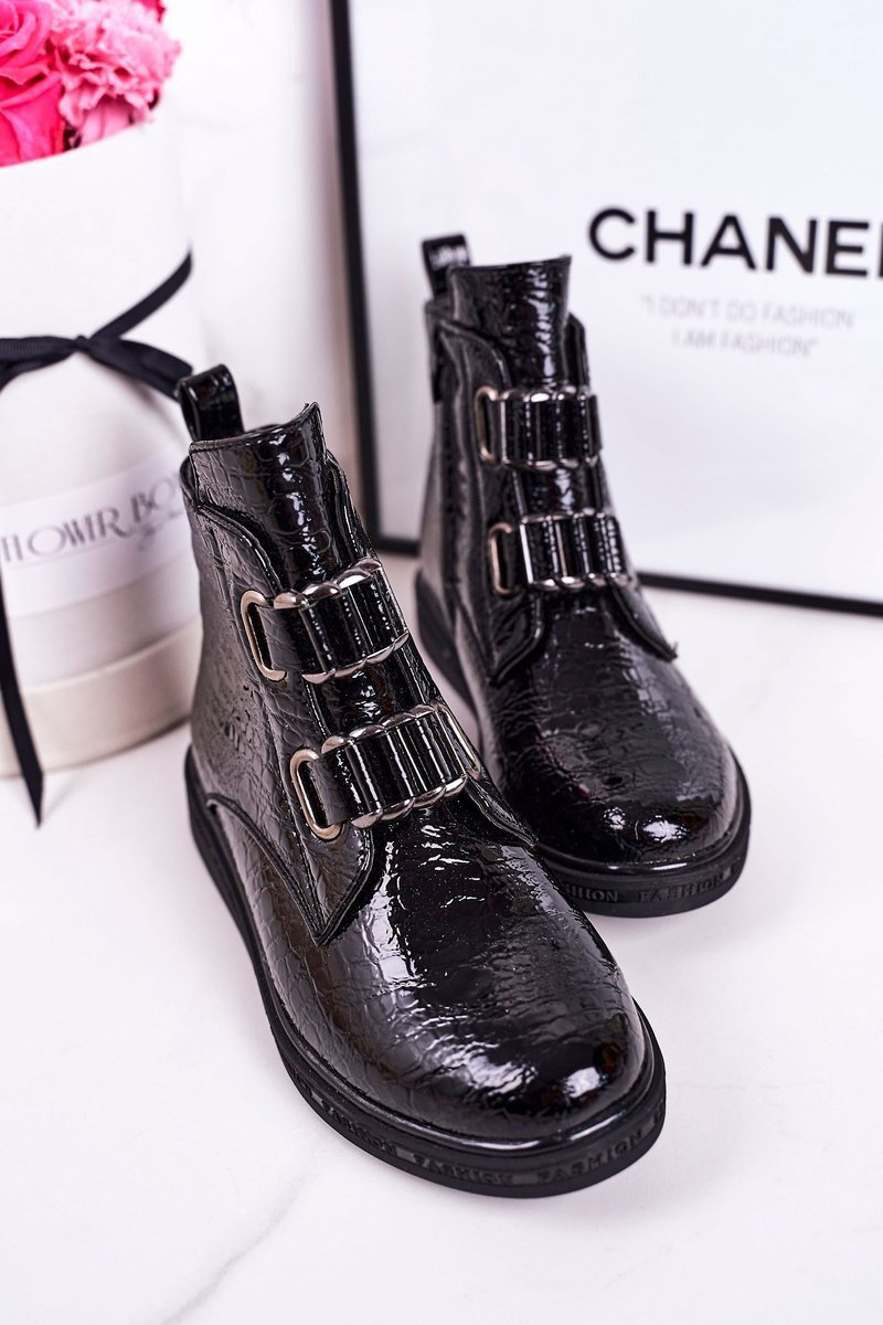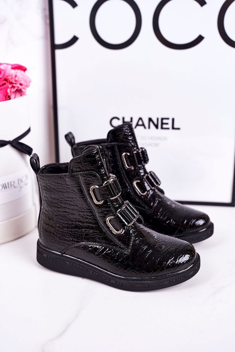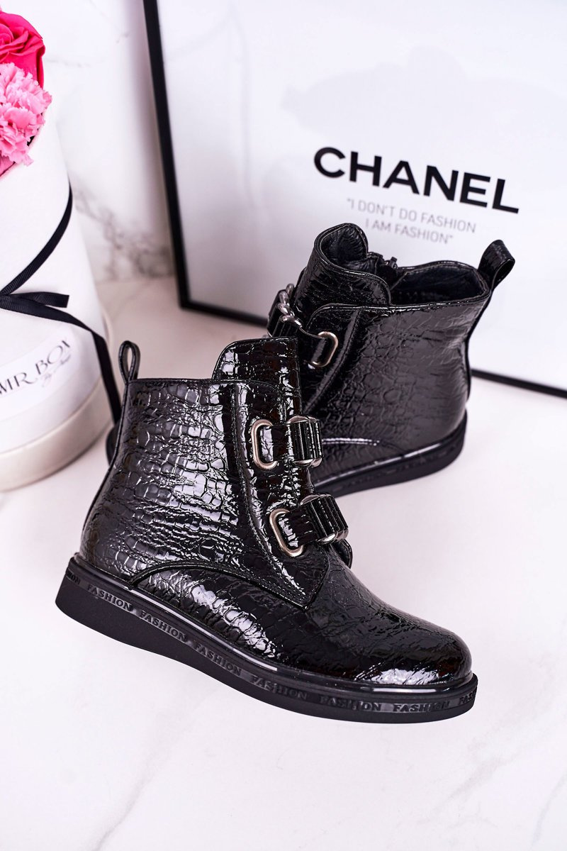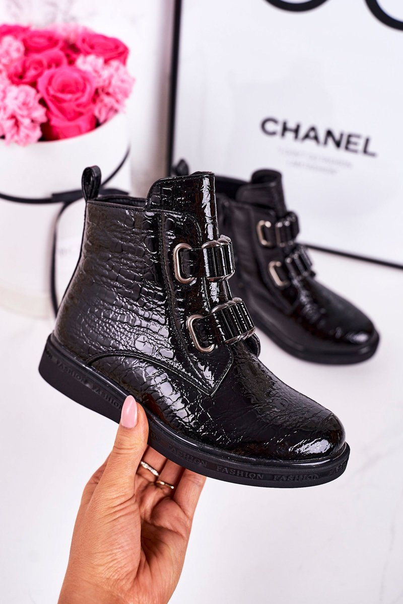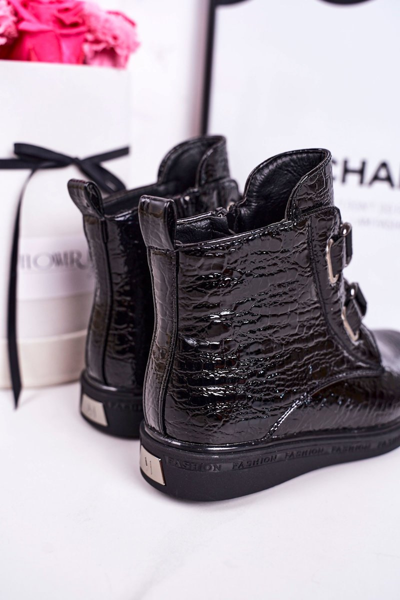 Дитячі утеплені черевики блискучі чорні з тваринним принтом Maya