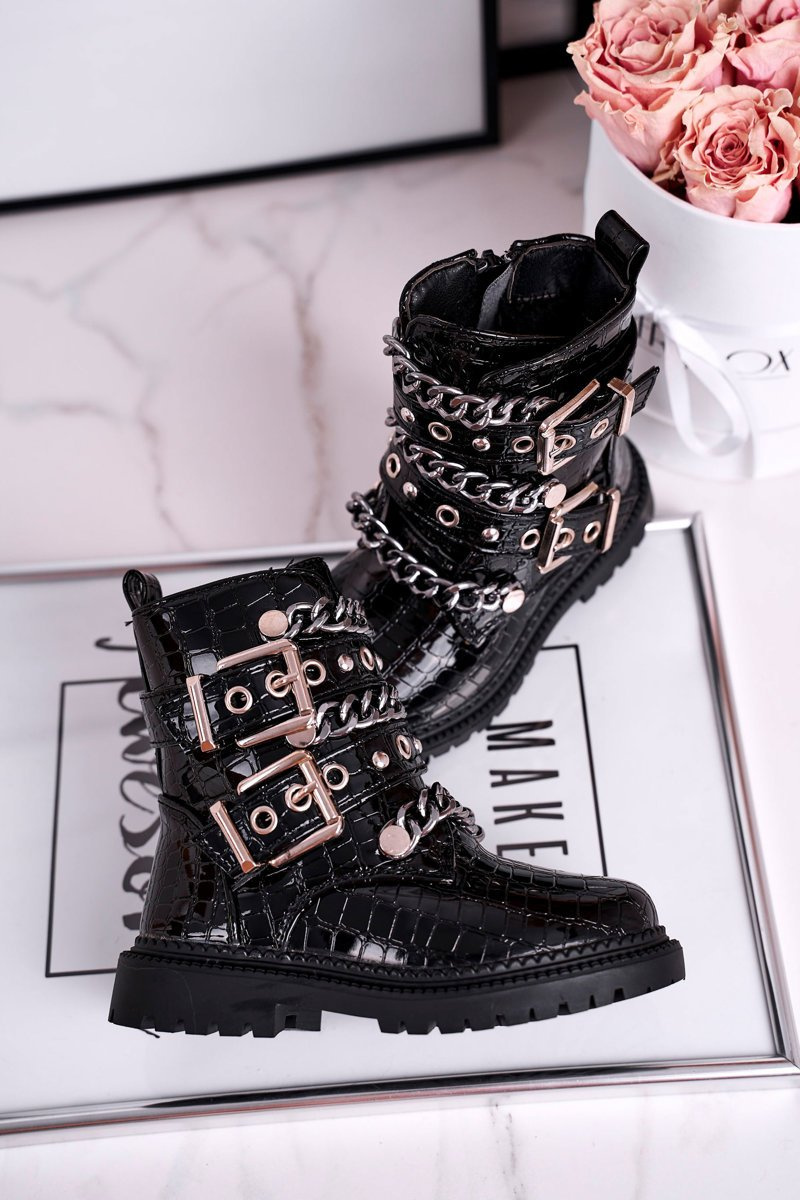 Дитячі чоботи теплі з хутряними пряжками ланцюжок принт чорні Fun Time