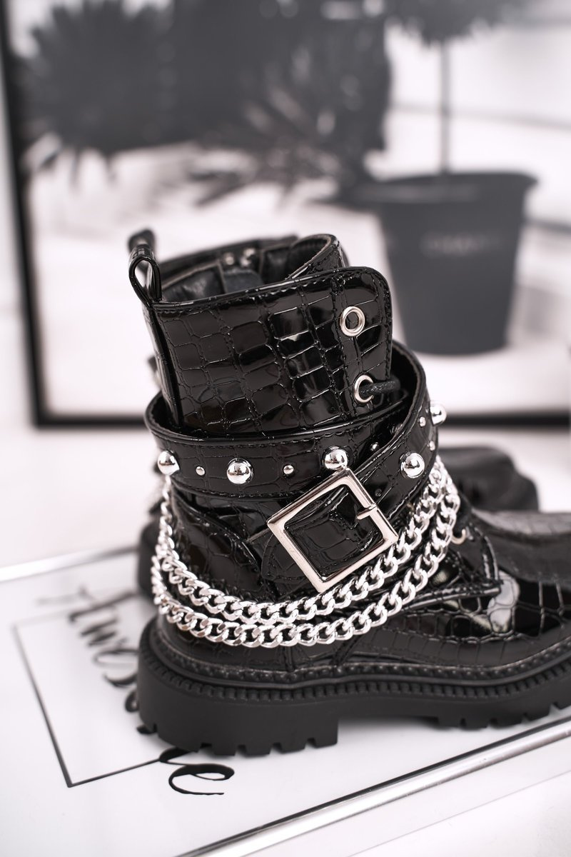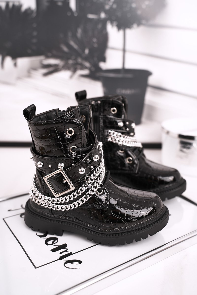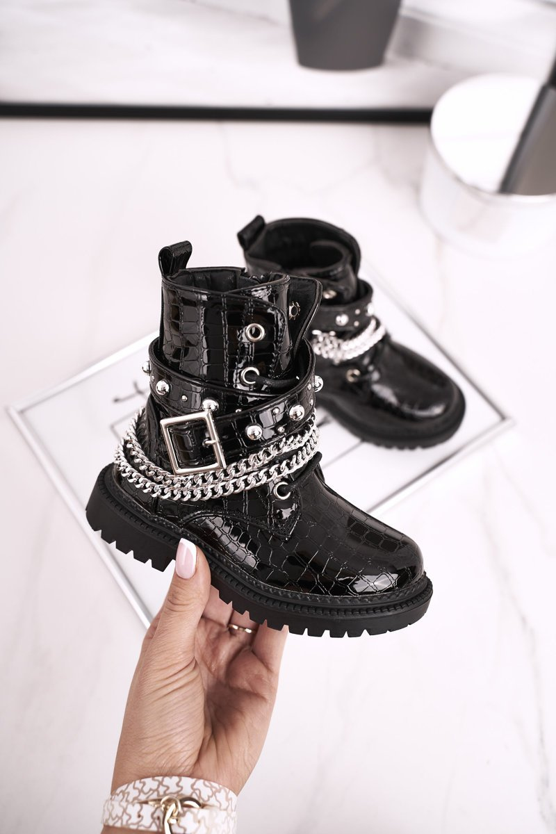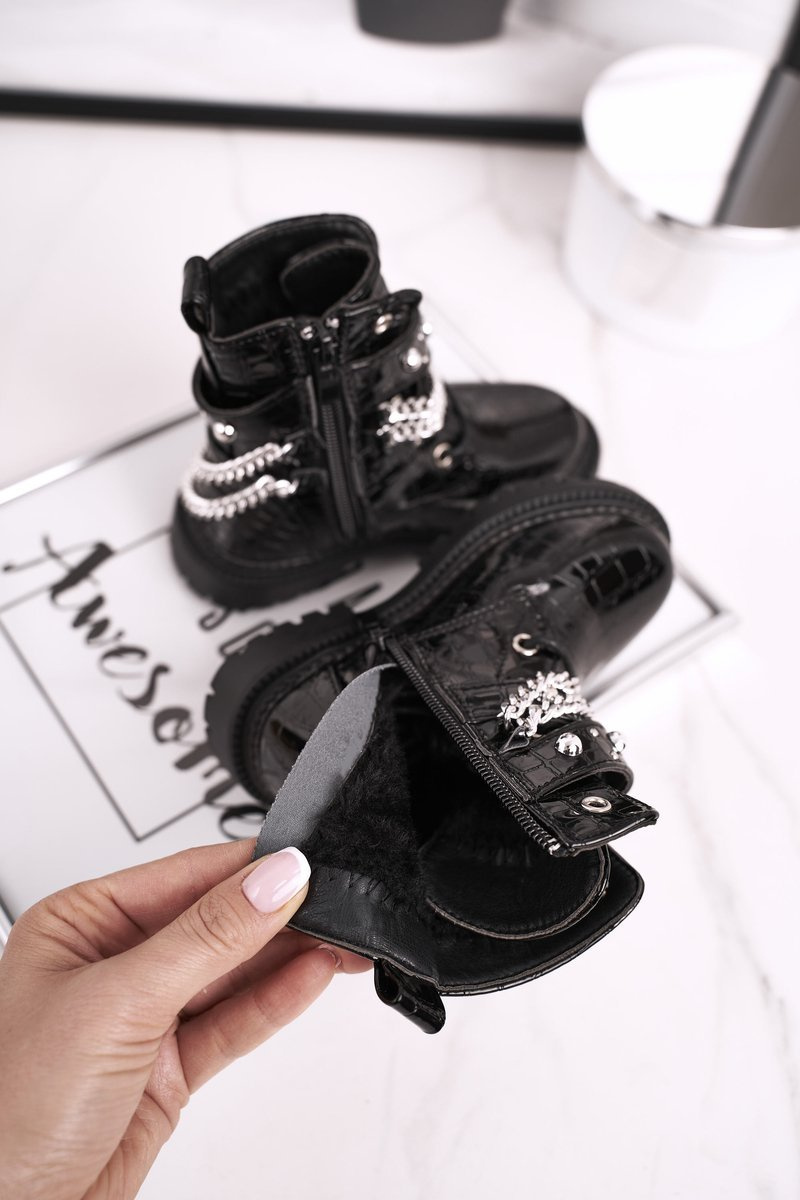 Дитячі чобітки на ланцюжку, утеплені хутром, лаковані Доллі чорного кольору