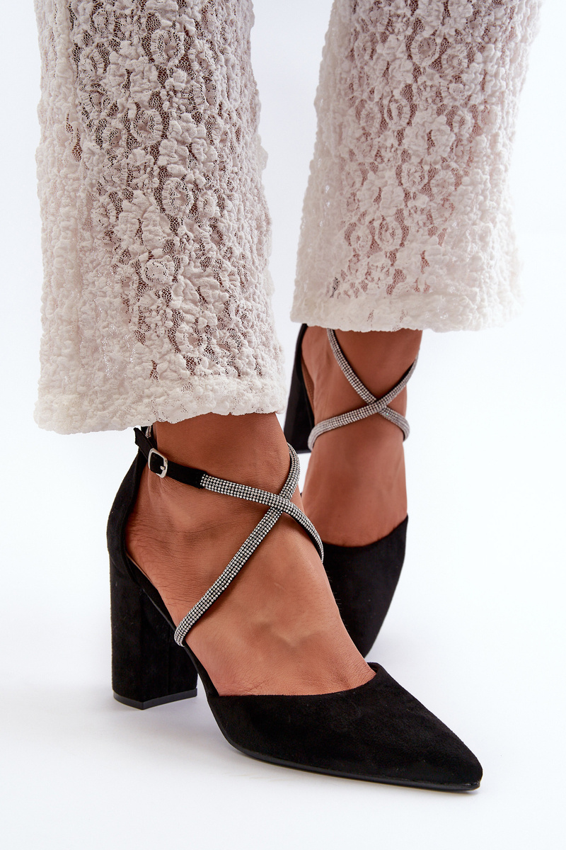 Жіночі човники з м'якої на дотик еко замші. Застібається навколо щиколотки за допомогою пряжки з регульованим ремінцем, прикрашеним цирконами. М'яка устілка з екошкіри забезпечує комфорт на кожному кроці. Встановлений на каблук у формі стовпчика. Гострі носки візуально стрункішають ноги. Вони чудово поєднуються з сукнями, елегантними брюками чи джинсами. Обираючи розмір, орієнтуйтеся на таблицю розмірів.