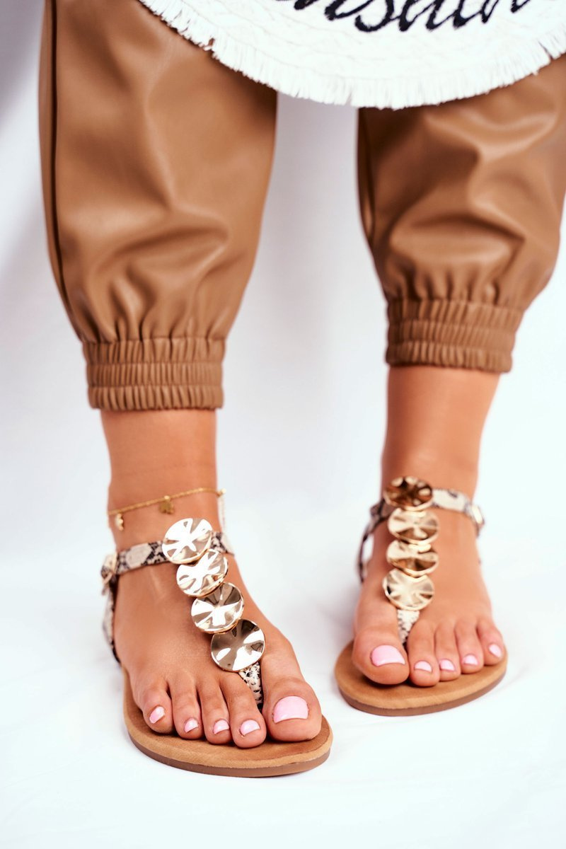 Чудова колекція модних босоніжок у вас під рукою. Босоніжки, прикрашені золотими пластинами, що надають їм елегантний вигляд. Використання ремінця з пряжкою дає нам можливість відрегулювати та краще прилягати до ноги. Ще одна перевага - м'яка устілка. Під час вибору розміру пропонуйте таблицю розмірів.