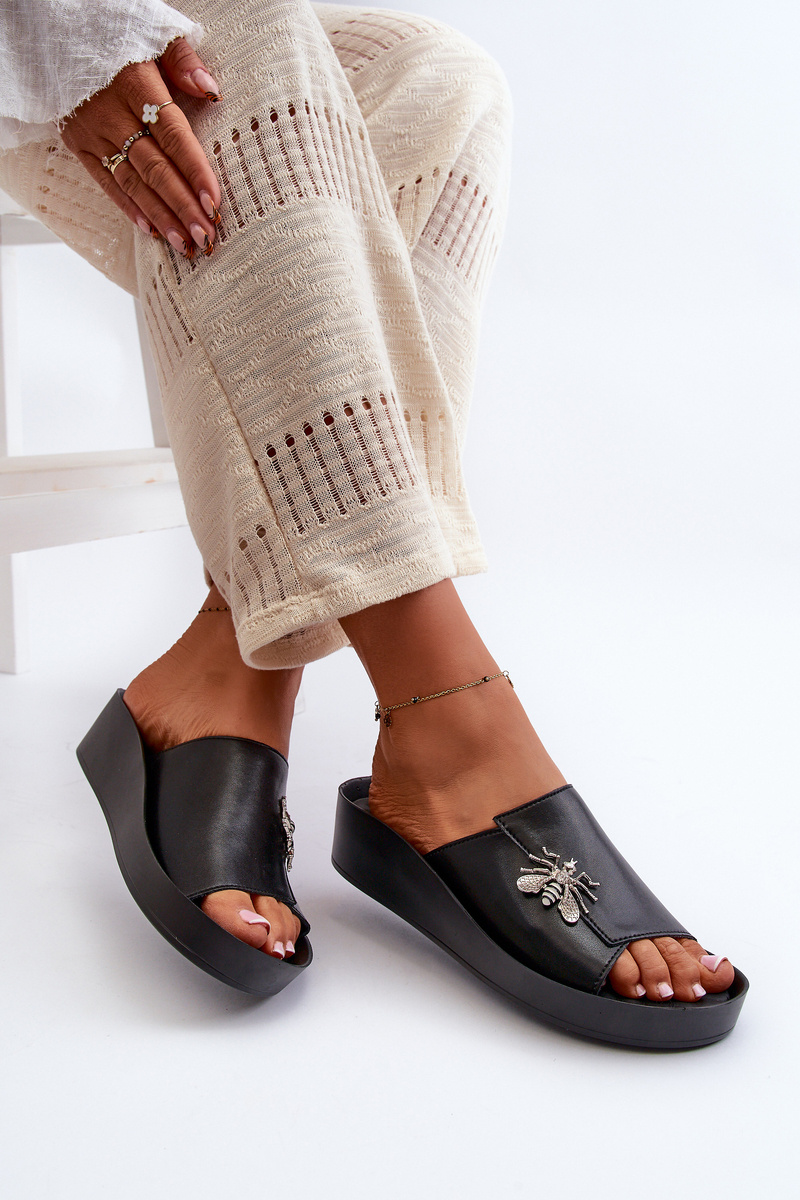 Жіночі босоніжки з високоякісної натуральної шкіри поєднують в собі елегантність і комфорт. Постав на стійкій платформі та делікатній танкетці. М'яка устілка, також з натуральної шкіри, забезпечує комфорт протягом усього дня. Чарівна прикраса на ремінці додає неповторний шарм і стиль, що робить їх ідеальним вибором для різних випадків, від повсякденних прогулянок до більш елегантних виходів. Обираючи розмір, орієнтуйтеся на таблицю розмірів.