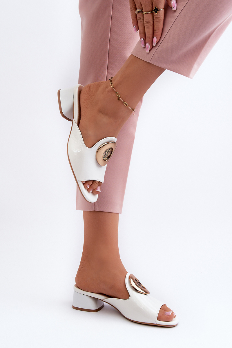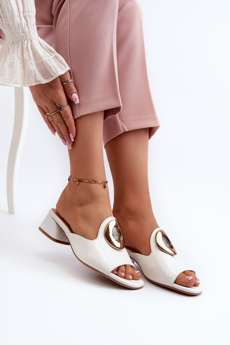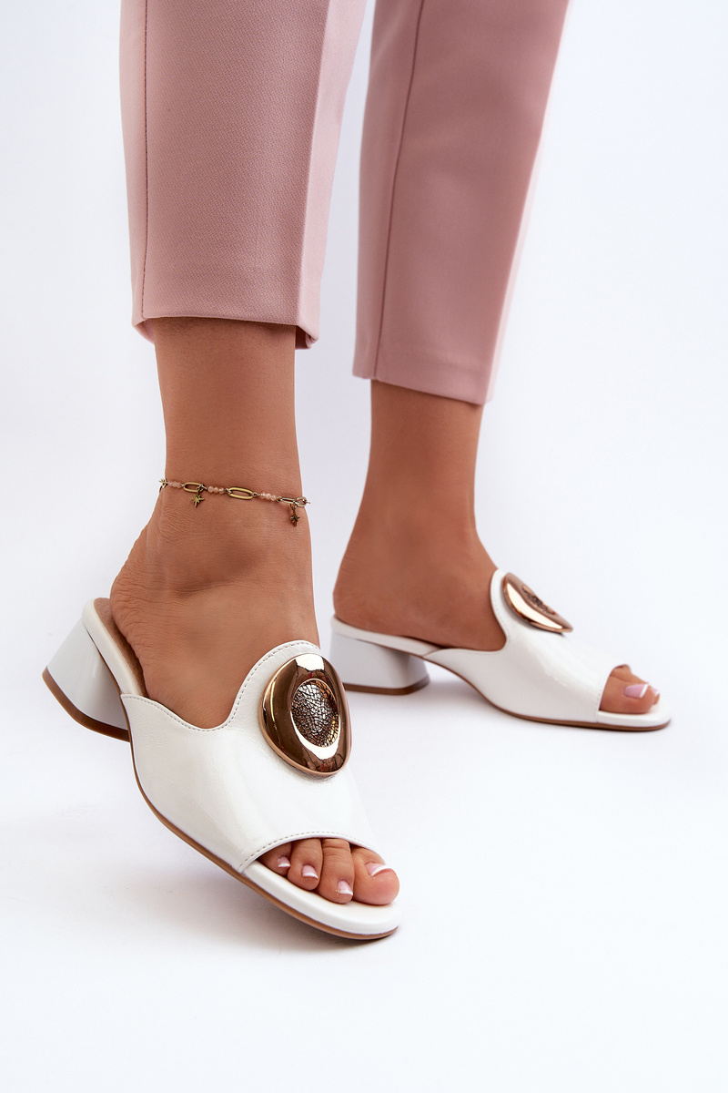 Елегантні лаковані жіночі мюлі на низькому каблуці з золотим декором білого кольору Uzimila
