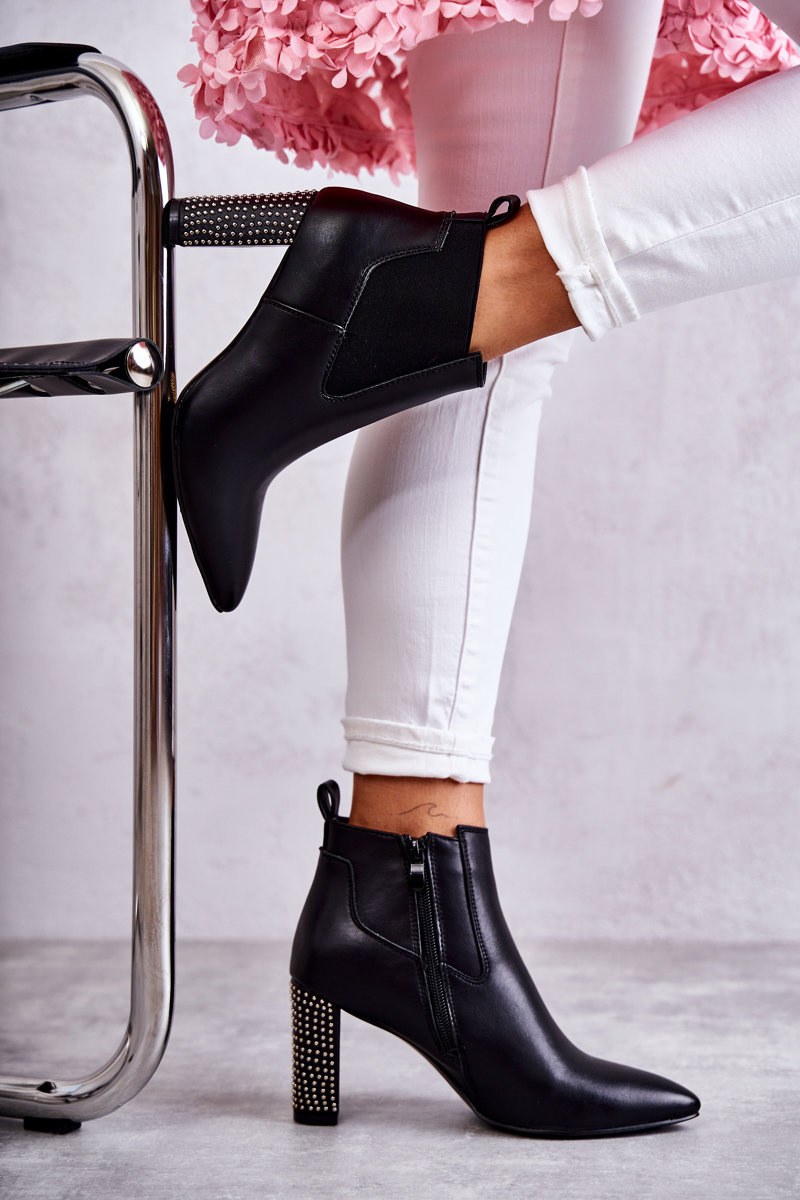 Черевики, які порадують багатьох любительок високих підборів! Виготовлені з еко шкіри. Вони мають жорсткий каблук. Гострий носок. Вони кріпляться на каблук у вигляді стовпчика, прикрашеного дрібними стразами. Гумка на верху дозволить правильно відрегулювати взуття по ширині ноги. Гарна модель для осінніх стилізацій! При виборі розміру скористайтеся таблицею розмірів.