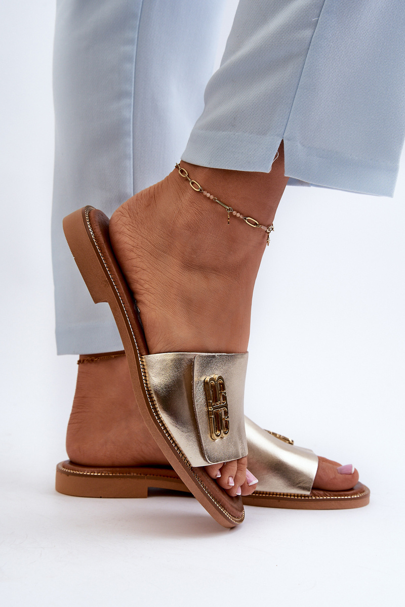 Елегантні жіночі шкіряні тапочки. Комплект на плоскій каблуці. Золотий декор спереду. Завдяки якісному виконанню ці тапочки стануть невід'ємною частиною літнього стилю! Обираючи розмір, орієнтуйтеся на таблицю розмірів.