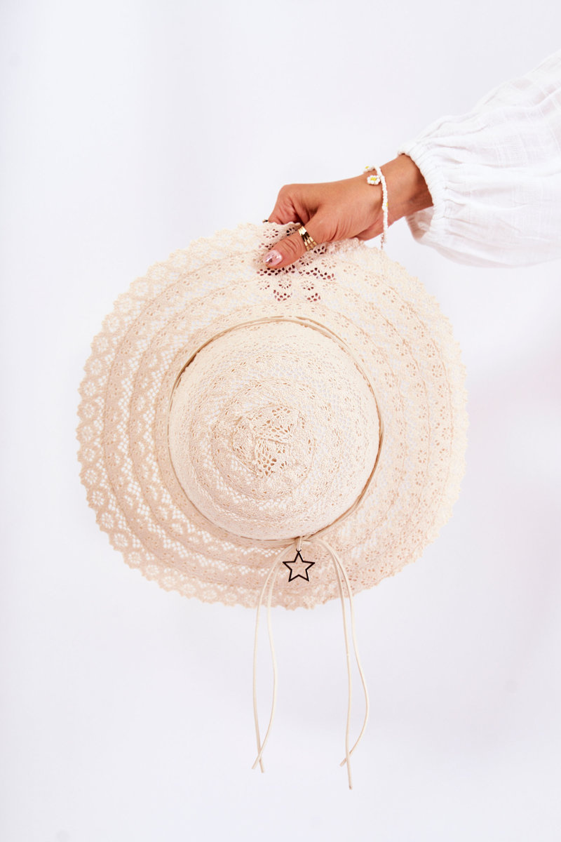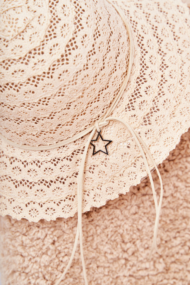 Жіноча шапка з декоративним ажуром. Має шкіряний ремінець, на якому є кулон у формі зірки. Шапка виготовлена з 46% бавовни, 44% поліестеру та 10% віскози. Виріб має шнурок, завдяки якому капелюх можна ідеально регулювати. Обов’язково перегляньте всю нашу колекцію головних уборів!