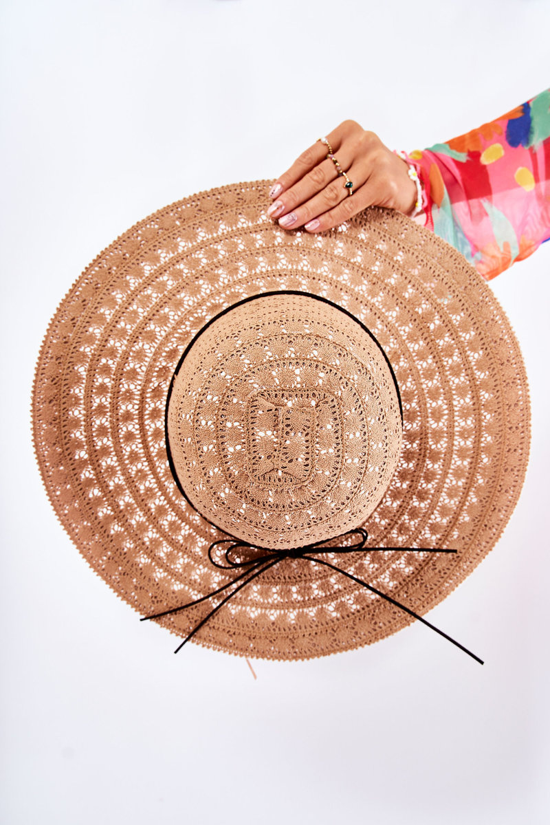 Жіноча шапка з декоративним ажуром. Має шкіряний ремінець з бантиком. Шапка виготовлена ​​з 46% бавовни, 44% поліестеру та 10% віскози. Виріб має шнурок, який дозволяє регулювати. Обов’язково перегляньте всю нашу колекцію головних уборів!