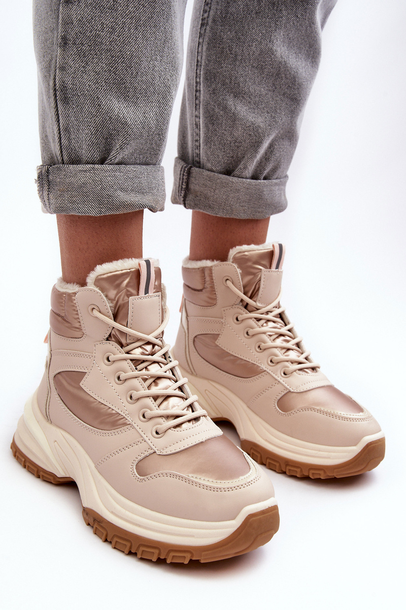 Жіноче утеплене спортивне взуття на хутряній підкладці. Виготовлений з комбінації екошкіри та текстилю. Цей модний фасон утепленого спортивного взуття встановлений на плоскій каблуці і масивній платформі з канавками. Завдяки вищій щиколотці вам буде неймовірно тепло. Вибираючи розмір, орієнтуйтеся на таблицю розмірів.