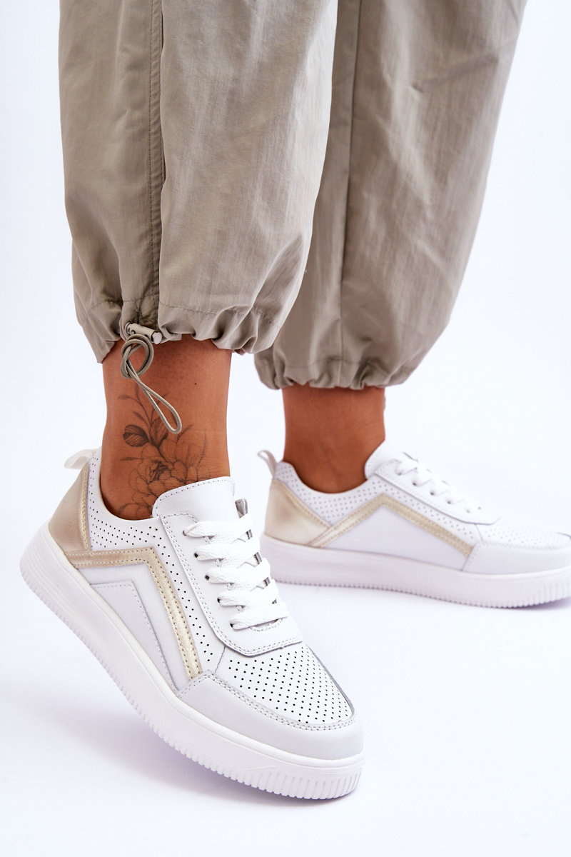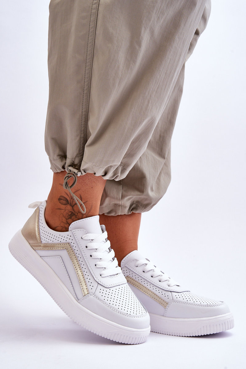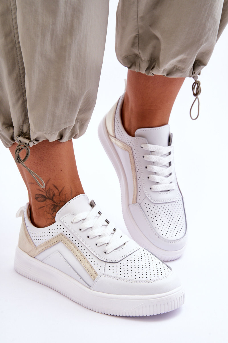 Жіноче шкіряне перфороване спортивне взуття біло-золотого кольору Carvalo