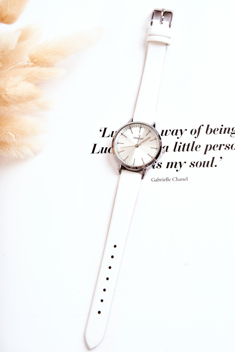 Годинник Ernest - модель для кожної жінки, яка цінує елегантні та модні аксесуари. Годинник має регульований ремінець з екологічної шкіри. Застібається на пряжку. Циферблат такого ж кольору, як і ремінець годинника. З нержавіючої сталі. Не містить нікелю.