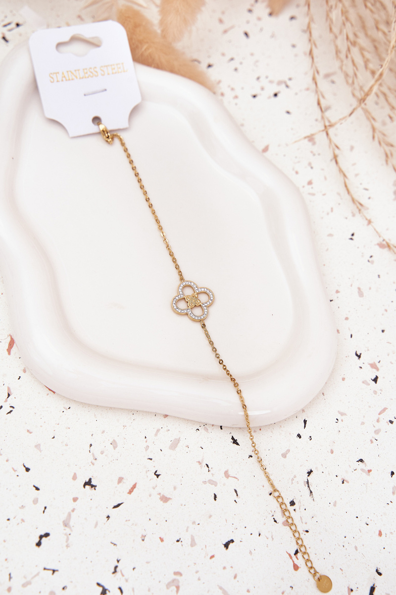 Жіночий браслет, виготовлений із хірургічної сталі золотого кольору, є аксесуаром, який додасть блиску будь-якому образу. Прикрашений сяючими цирконіями, виглядає ніжно і дуже жіночно. Регульований застібка дозволяє ідеально підлаштувати його до зап'ястя, забезпечуючи комфорт при носінні. Стильний, міцний і універсальний — ідеально підходить як для щоденного носіння, так і для особливих випадків.