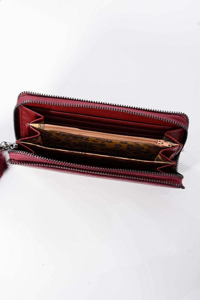 Жіночий великий гаманець, червоний брелок з декоративним замком і помпоном, темно-бордовий