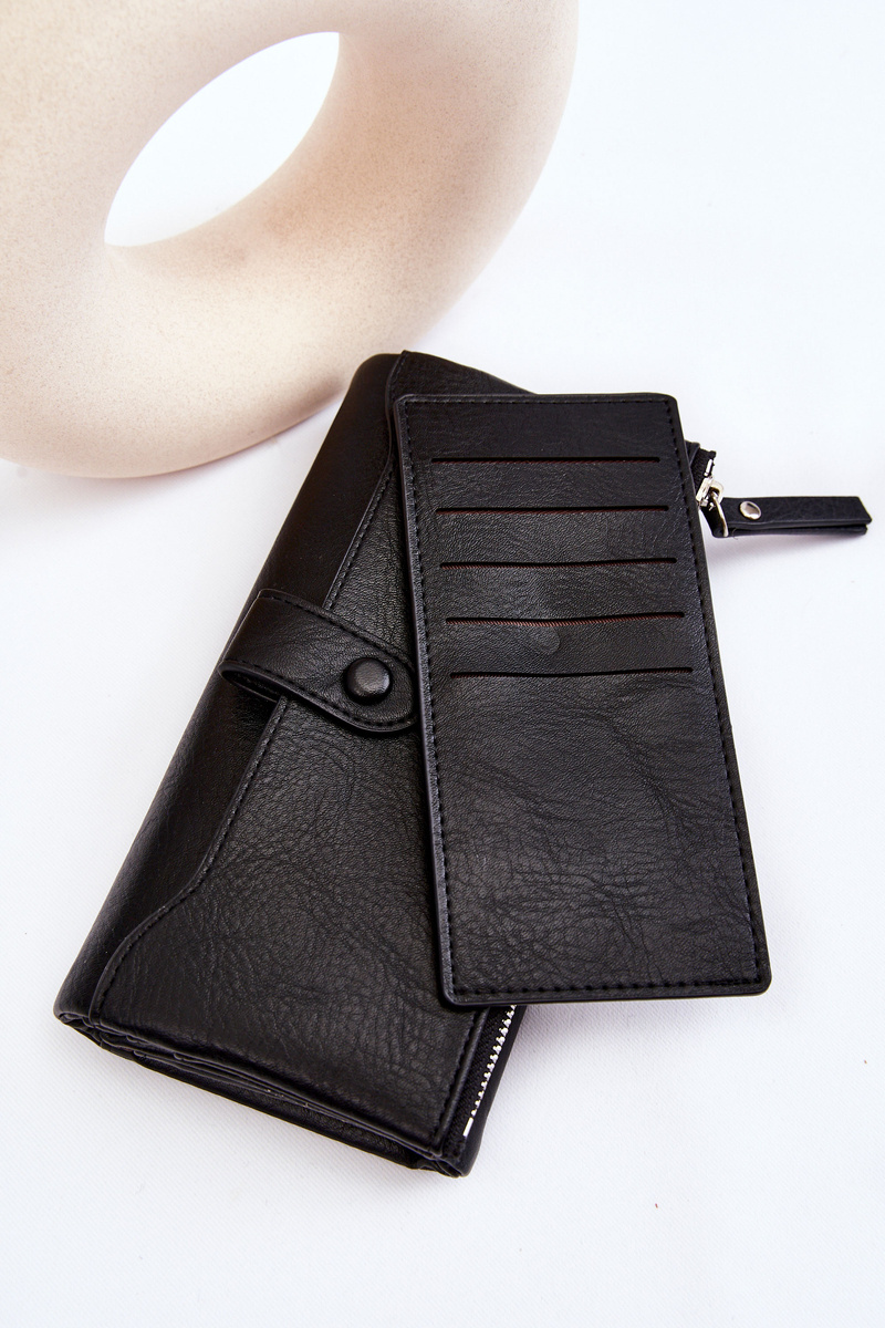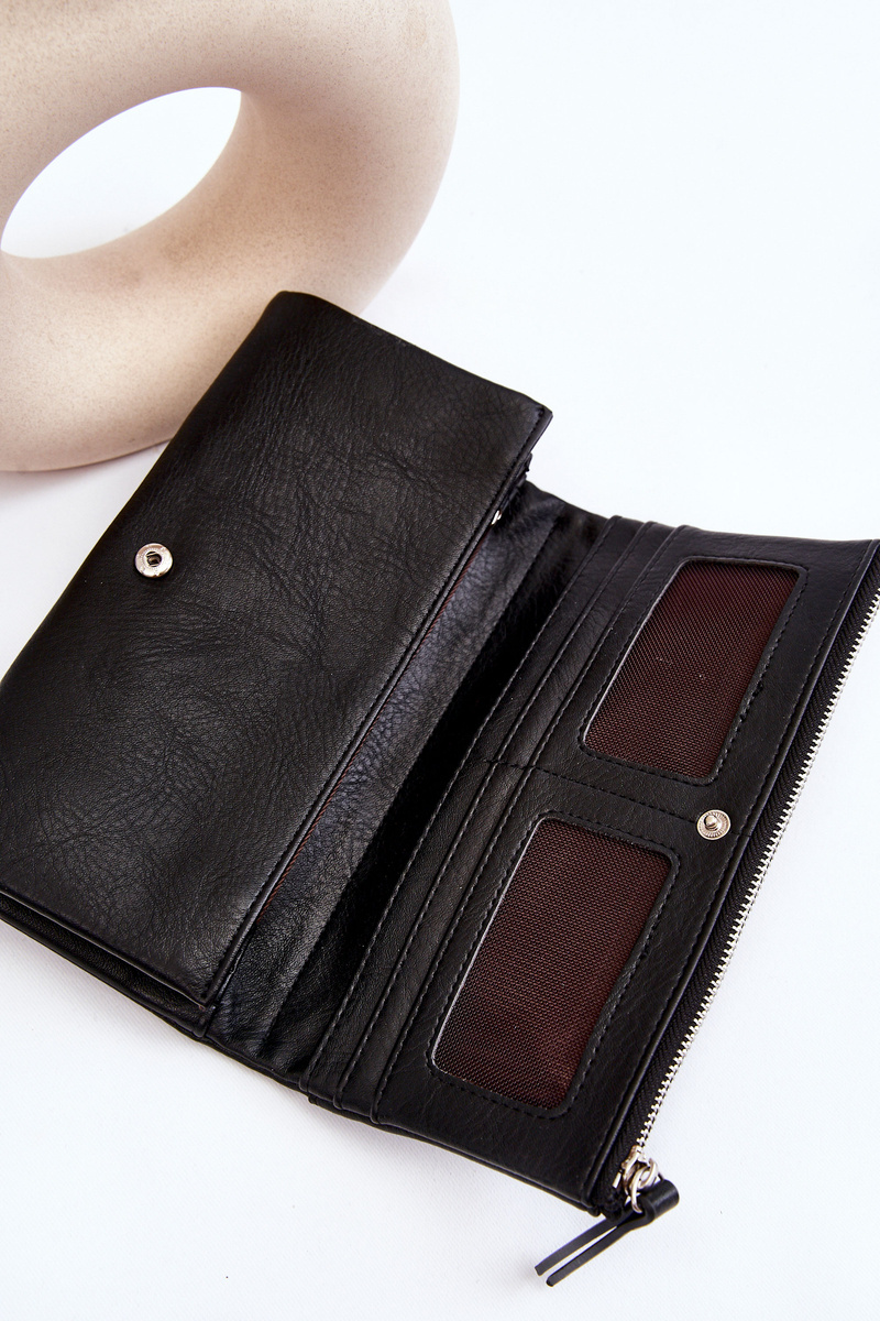 Великий жіночий гаманець застібається на кнопки та блискавку. Виконана з еко шкіри. Всередині є відкриті камери і одна закрита на блискавку. Крім того, гаманець також містить багато місць для візиток або кредитних карток. Зовні також є додаткова кишеня, що закривається на блискавку, і ще одне відділення, що застібається на кнопку. У цьому гаманці помістяться найнеобхідніші речі, такі як: документи або гроші.