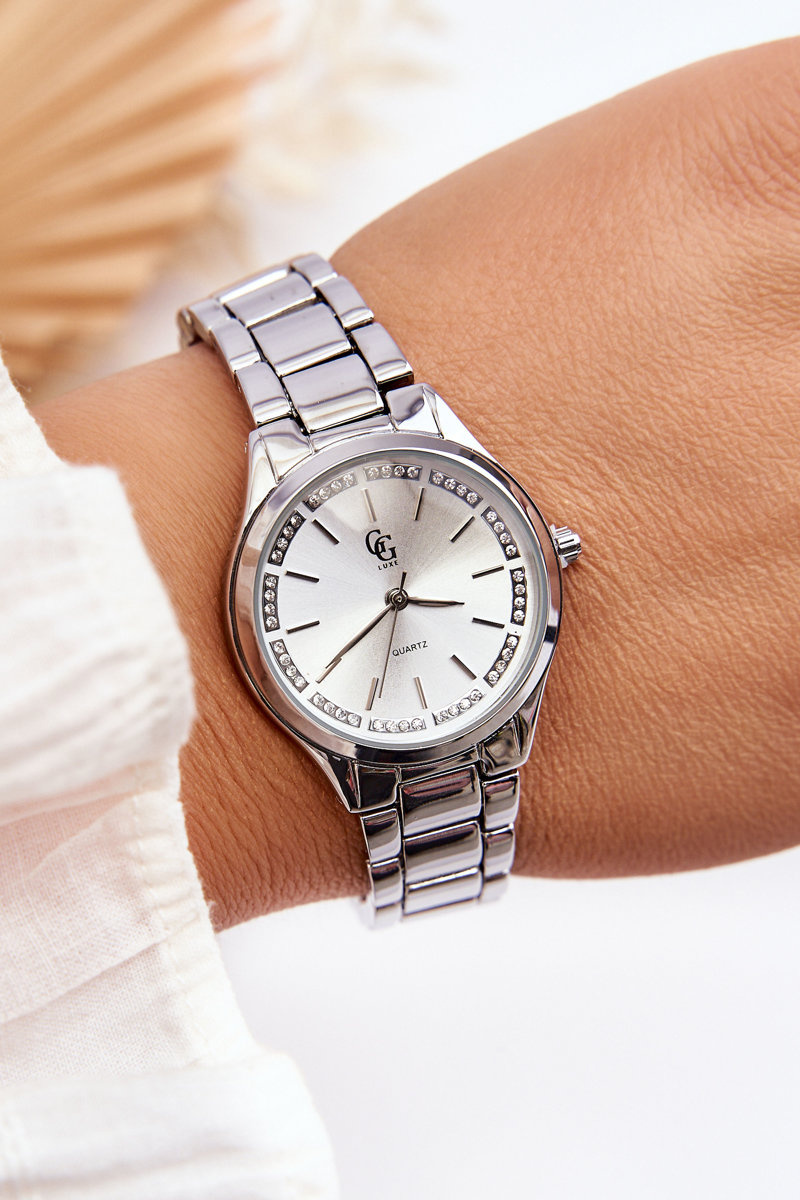 Водонепроникний жіночий годинник від бренду GG Luxe виготовлений з нержавіючої сталі. Масивний браслет дозволить почувати себе впевнено в цьому годиннику! Цей годинник має застібку, яка не регулюється. Циферблат був прикрашений блискучими стразами, що імітують циркони. Клас водонепроникності цього годинника 3ATM. До годинника також додається декоративна коробка.