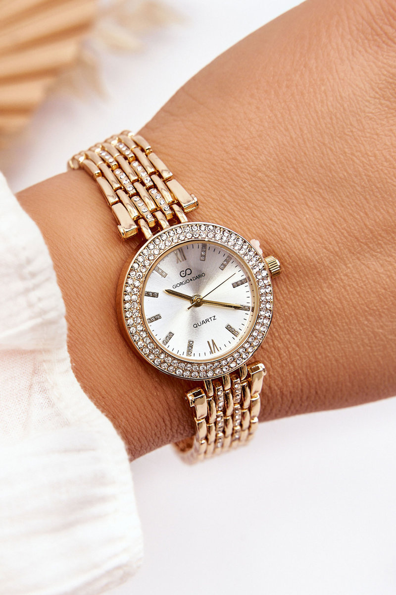 Елегантний жіночий годинник від бренду Giorgio&Dario стане ідеальним доповненням до багатьох стилів. Виготовляється з нержавіючої сталі. Має круглий корпус і браслет із застібкою. Циферблат з римськими цифрами також збагачений стразами, що імітують циркони.