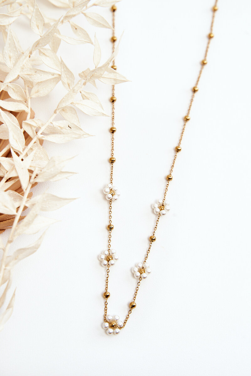 Модне кольє на тонкому ланцюжку знаменитого типу з переплетенням відкривачки. Він був виготовлений з нержавіючої сталі. Має можливість регулювати довжину. На ланцюжку прикраси у вигляді квітів з бісеру. Цей вид прикрас є чудовим доповненням до стилю не тільки повсякденного, але й більш елегантного. Дана модель має класичну застібку-карабін.