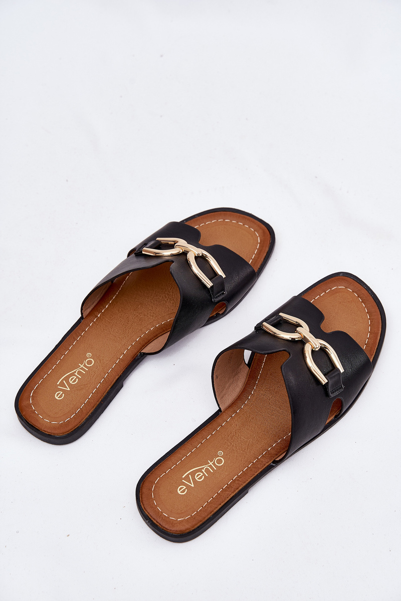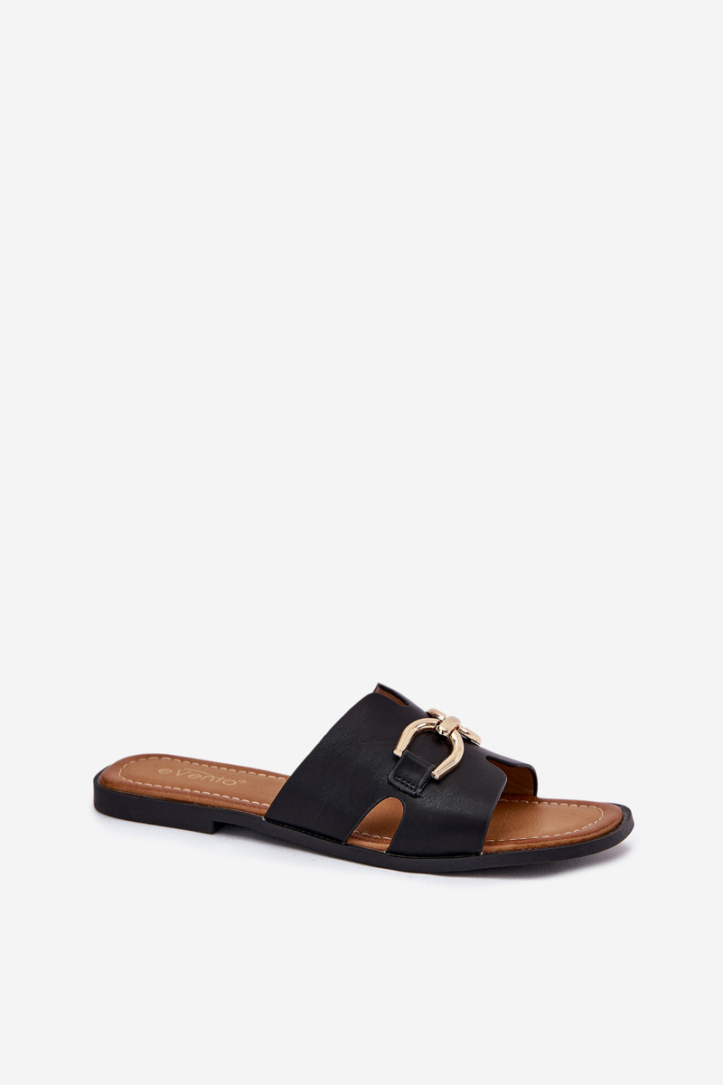 Жіночі шльопанці, виготовлені з еко-шкіри. Встановлені на плоскому каблуці, вони забезпечують комфорт протягом усього дня. Спереду є тонка золота декоративна деталь, яка надає їм унікального характеру. Ідеальні для повсякденного носіння, вони чудово поєднуються з повсякденними вбраннями. Будь ласка, зверніться до розмірної сітки при виборі розміру.