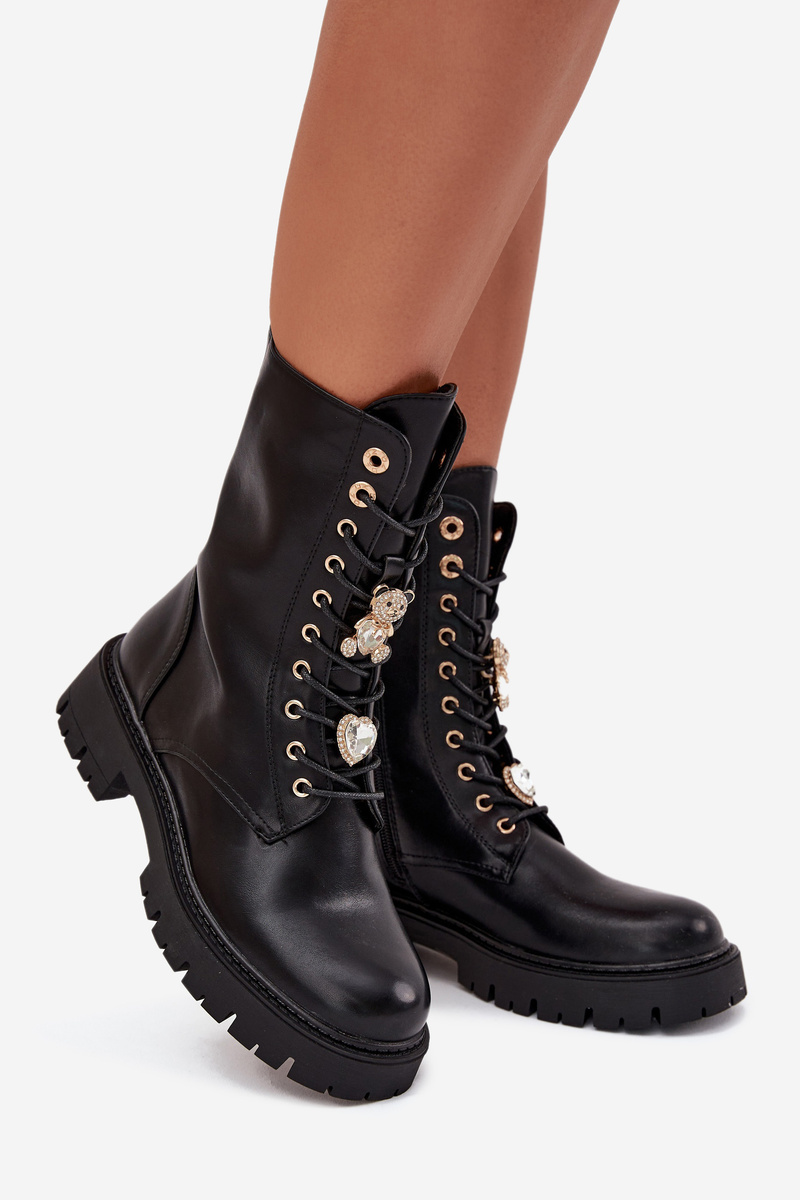 Жіночі черевики з еко-шкіри - це поєднання стилю та комфорту для холодніших днів. Модель на шнурівці з додатковою блискавкою, що полегшує взування та підгонку до ноги. Всередині утеплено взуттєвою ковдрою, що забезпечує тепло навіть у морозні дні. На шнурівці є милі підвіски у формі ведмедя та серця, які надають черевикам унікальний, модний акцент. Ідеально підходять для щоденних виходів. При виборі розміру, будь ласка, звертайтеся до таблиці розмірів. Будь ласка, зверніться до розмірної сітки при виборі розміру.