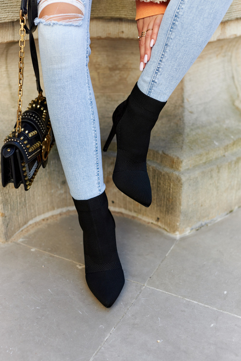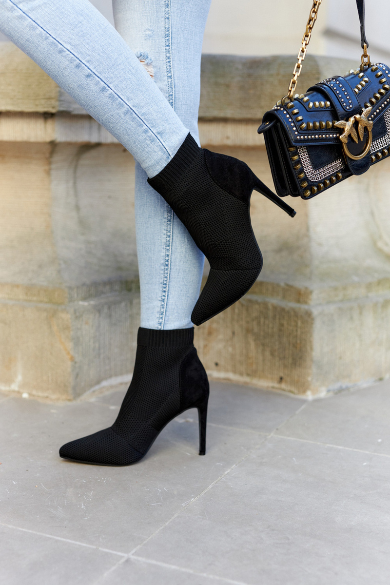 Черевики мають стильний верх щиколотки, схожий на носок. Встановіть на шпильку. Гострий носок ідеально витончить стопу. Модель сліпони, ідеально облягає ногу. Верх виконаний з комбінації еластичного ребристого текстильного матеріалу та екошкіри. Устілка з еко шкіри. Взуття має жорсткий каблук. Ідеально підходить для джинсів, джоггерів або подовжених тунік. При виборі розміру дотримуйтеся таблиці розмірів.