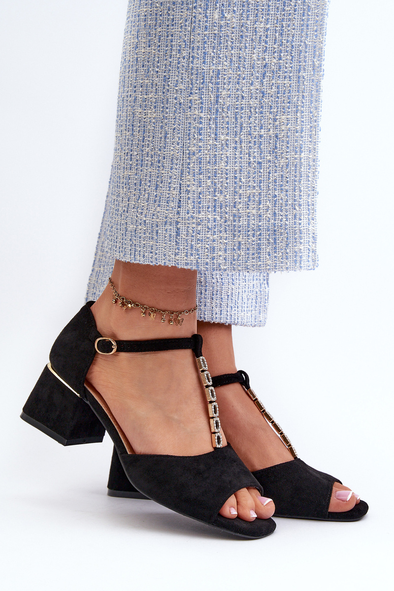 Жіночі босоніжки з блоковим каблуком і декоративним ремінцем з еко замші чорного кольору Obivena