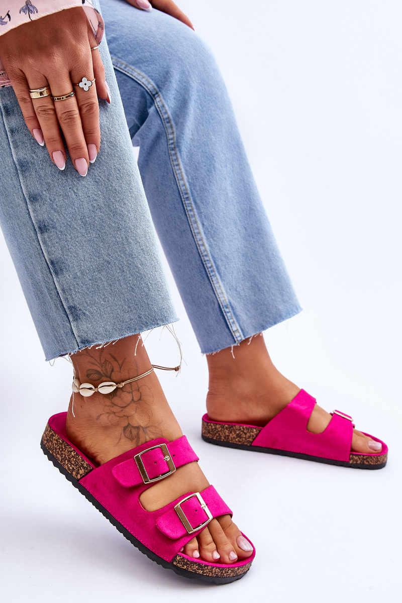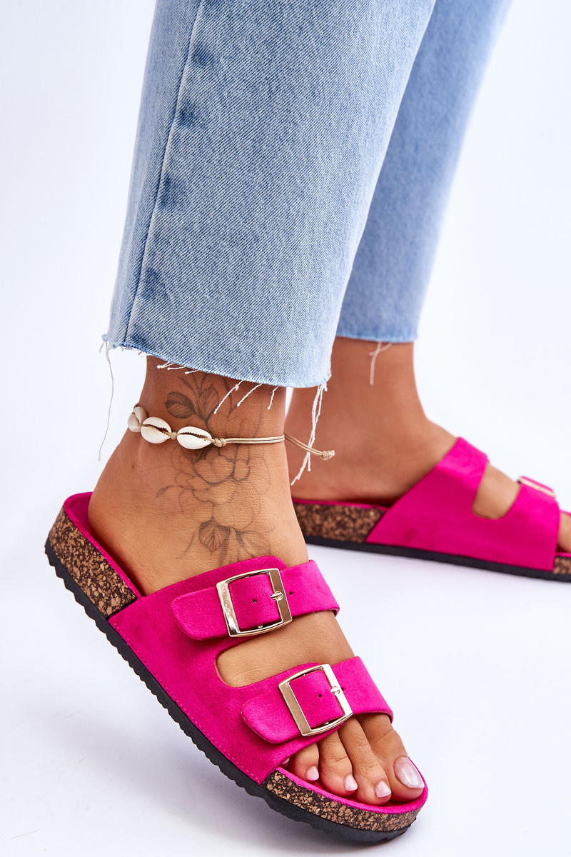 Жіночі тапочки виготовлені з приємної на дотик еко замші. Мають декоративні пряжки з регульованими ремінцями. Ця модель була встановлена ​​на коркову платформу. Ідеальне взуття для літнього сезону. Ці шльопанці мають профільовану зручну устілку. Ви обов'язково повинні їх мати! Обираючи розмір, орієнтуйтеся на таблицю розмірів.