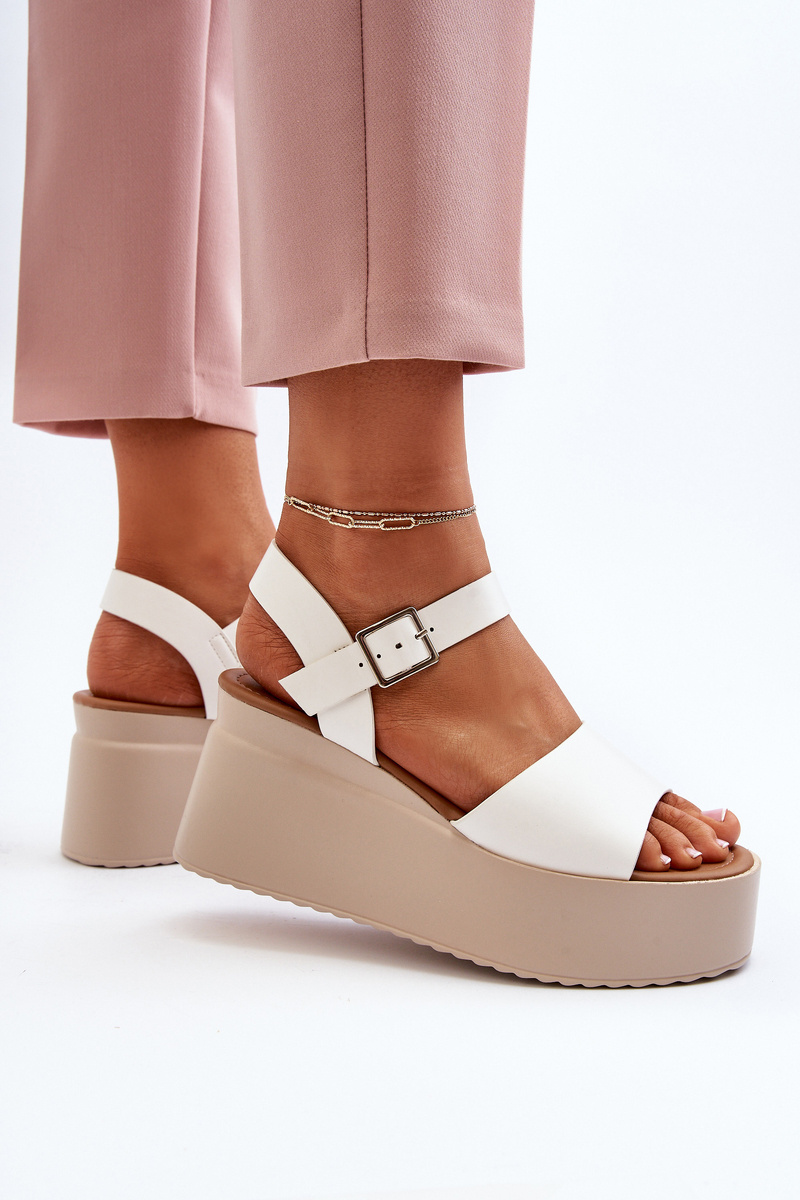 Жіночі босоніжки з еко шкіри. Комплект на танкетці і платформі, що не тільки додає їм модний вигляд, але і забезпечує стійкість при ходьбі. Застібаються на регульовану пряжку, ви можете легко підлаштувати їх під ногу. Обираючи розмір, орієнтуйтеся на таблицю розмірів.