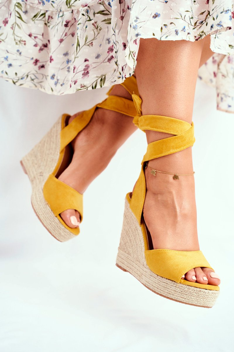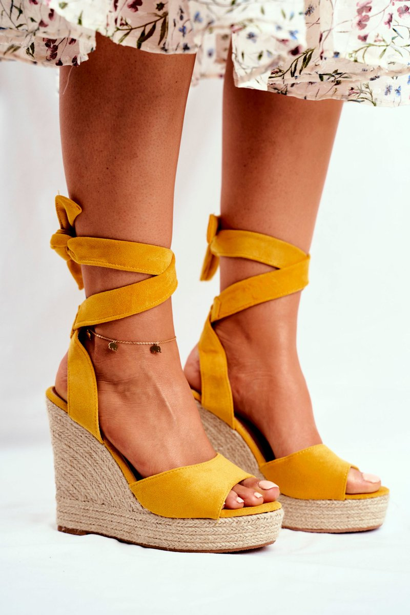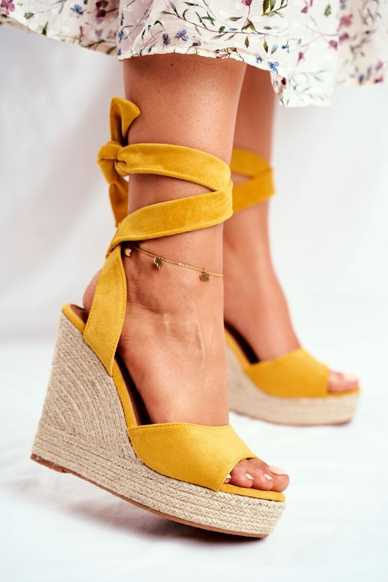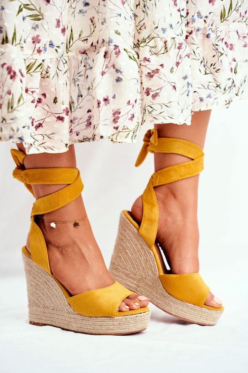 Високе взуття - це не тільки високі підбори, якщо ви любите іноді парити над землею, подивіться, що ми маємо для вас. Унікальні босоніжки на танкетці, які завдяки високій танкетці та платформі 3,5 см підтягнуть вашу фігуру. Повністю виготовлений з еко-замші в декількох прекрасних кольорах, що дає нам багато можливостей для створення красивих стилів. Легко одягається завдяки пряжці навколо щиколотки. Танкетка прикрашена плетеним шнурком. Під час вибору розміру пропонуйте таблицю розмірів.