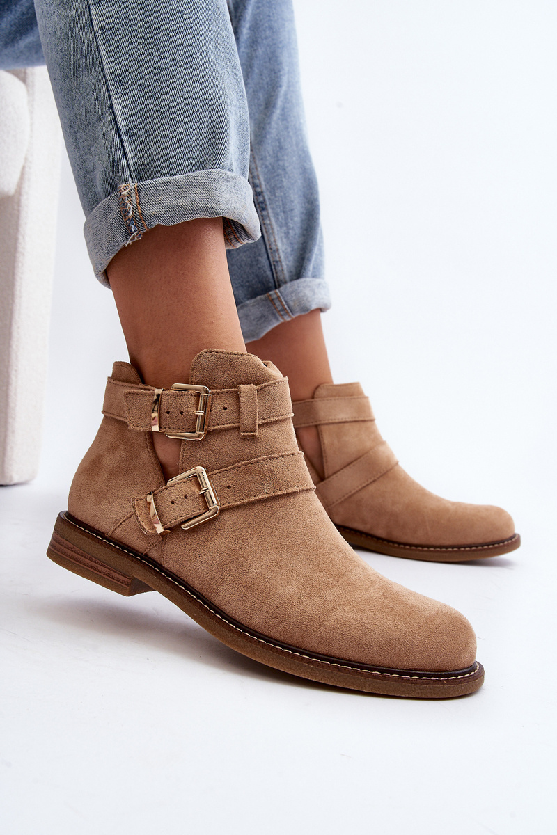 Класичні жіночі ботильйони з еко замші. Комплект на плоскій каблуці. Верх прикрашений ремінцями з пряжкою. Модель сліпони. Заокруглені пальці. Крім того, дана модель має посилений ковпачок на п'яті. Ідеально підходить для багатьох весняних укладок з брюками, спідницями та сукнями. Обираючи розмір, орієнтуйтеся на таблицю розмірів.