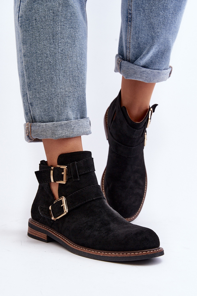 Класичні жіночі ботильйони з еко замші. Комплект на плоскій каблуці. Верх прикрашений ремінцями з пряжкою. Модель сліпони. Заокруглені пальці. Крім того, дана модель має посилений ковпачок на п'яті. Ідеально підходить для багатьох весняних укладок з брюками, спідницями та сукнями. Обираючи розмір, орієнтуйтеся на таблицю розмірів.