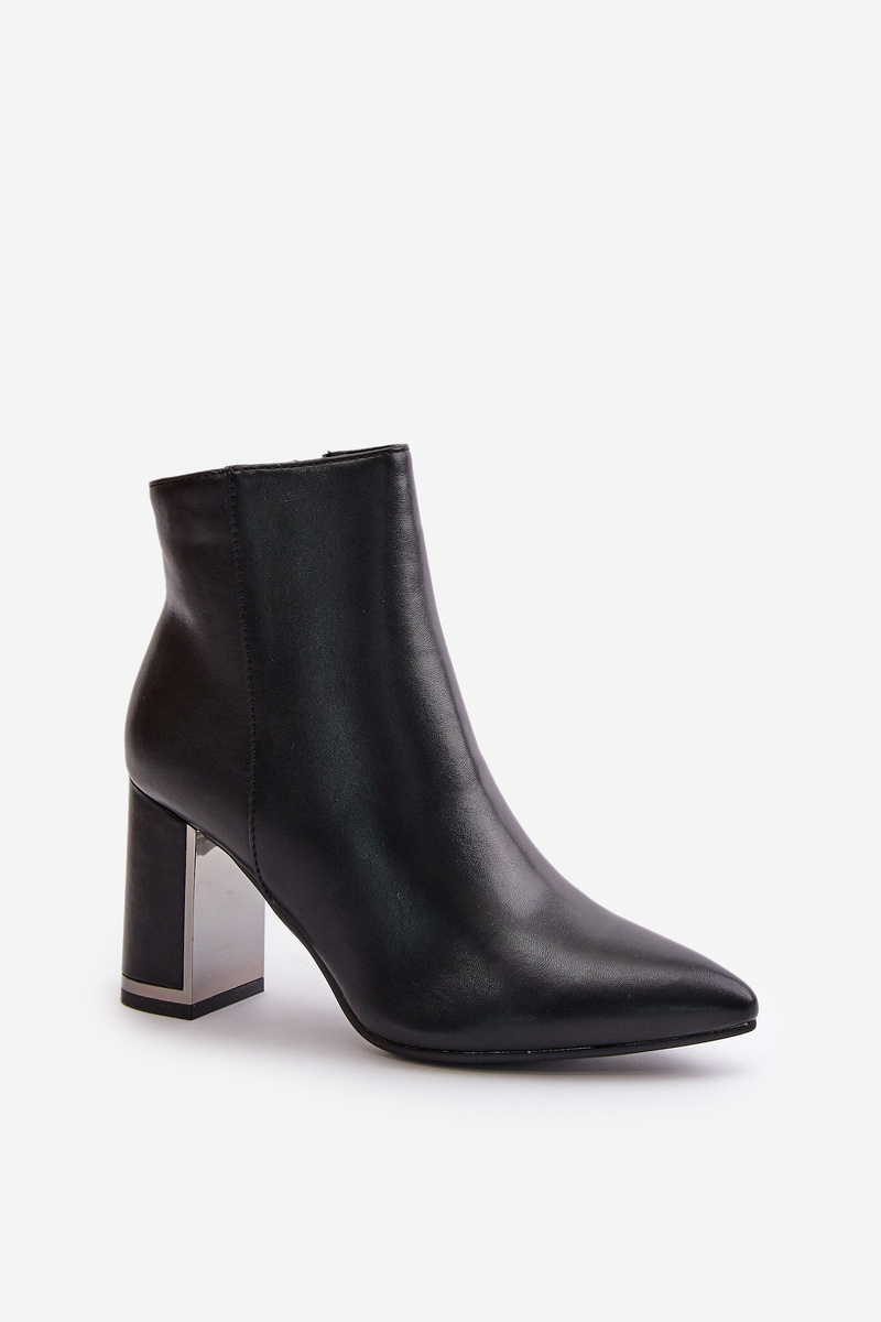 Жіночі ботильйони з екошкіри. Інтер'єр утеплений, що забезпечує тепло та комфорт у прохолодні дні. Загострені носки надають їм стильного характеру, а каблук у вигляді стійкої колодки додатково прикрашений дзеркальним елементом, що додає чобіткам неповторний блиск і модний акцент. Ви обов'язково повинні мати їх у своєму осінньо-зимовому гардеробі! Обираючи розмір, орієнтуйтеся на таблицю розмірів.