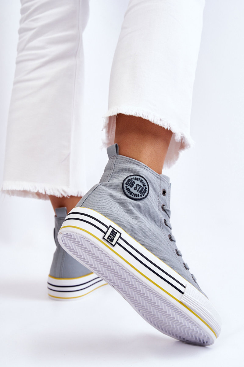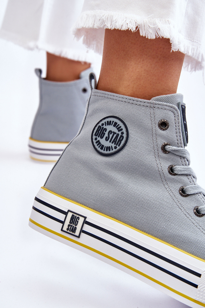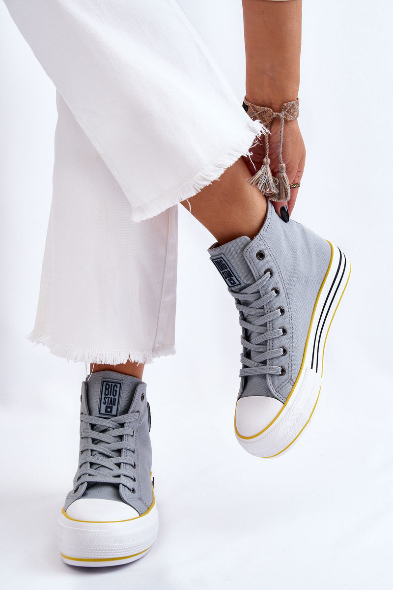Високі жіночі кросівки виготовлені з текстильного матеріалу. Класична модель на шнурівці. Взуття було встановлено на масивній гумовій платформі з неслизькою підошвою. Збоку верхня частина має гумовий логотип Big Star. Посилений каблук забезпечить належну стабілізацію стопи. Ця модель довжиною до щиколотки ідеально підійде для весняно-осіннього сезону.При виборі розміру орієнтуйтеся на таблицю розмірів.