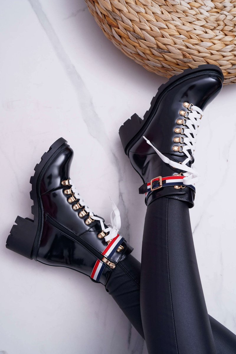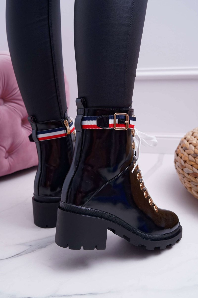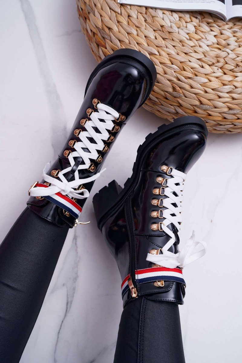 Високі чоботи на шнурівці із застібкою збоку. Вони ідеально впишуться в майбутні модні тенденції. Виготовлений з високоякісної лакованої еко шкіри. Міцна шнурівка, яка забезпечує зручність, і міцна нековзна підошва. Інтер'єр покритий ковдрою для взуття. Під час вибору розміру запропонуйте таблицю розмірів, яка доступна після наведення курсора на розмір або натискання на нього.